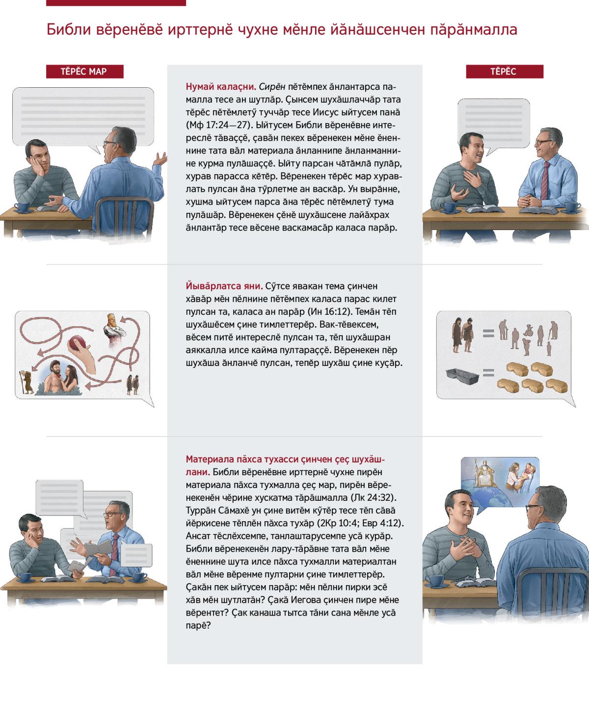 Материала пӑхса тухасси ҫинчен ҫеҫ шухӑшлани. Библи вӗренӗвне ирттернӗ чухне пирӗн материала пӑхса тухмалла ҫеҫ мар, пирӗн вӗренекенӗн чӗрине хускатма тӑрӑшмалла (Лк 24:32). Туррӑн Сӑмахӗ ун ҫине витӗм кӳтӗр тесе тӗп сӑвӑ йӗркисене тӗплӗн пӑхса тухӑр (2Кр 10:4; Евр 4:12). Ансат тӗслӗхсемпе, танлаштарусемпе усӑ курӑр. Библи вӗренекенӗн лару-тӑрӑвне тата вӑл мӗне ӗненнине шута илсе пӑхса тухмалли материалтан вӑл мӗне вӗренме пултарни ҫине тимлеттерӗр. Ҫакӑн пек ыйтусем парӑр: мӗн пӗлни пирки эсӗ хӑв мӗн шутлатӑн? Ҫакӑ Иегова ҫинчен пире мӗне вӗрентет? Ҫак канаша тытса тӑни сана мӗнле усӑ парӗ?