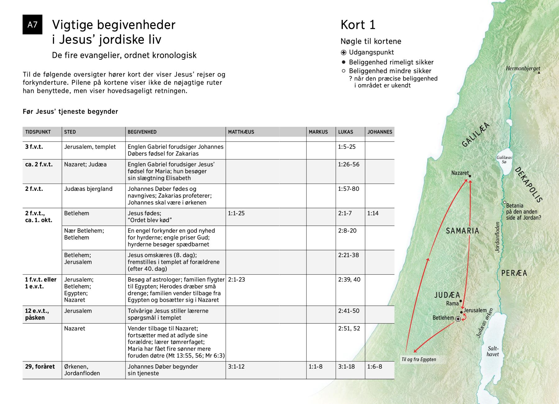 Til de følgende oversigter hører kort der viser Jesus’ rejser og forkynderture. Pilene på kortene viser ikke de nøjagtige ruter han benyttede, men viser hovedsageligt retningen.