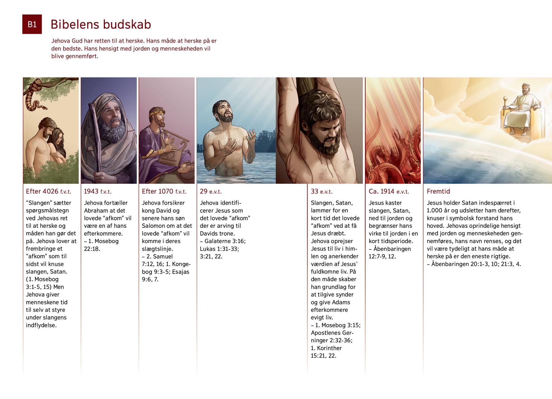 33 e.v.t. Slangen, Satan, lammer for en kort tid det lovede “afkom” ved at få Jesus dræbt. Jehova oprejser Jesus til liv i himlen og anerkender værdien af Jesus’ fuldkomne liv. På den måde skaber han grundlag for at tilgive synder og give Adams efterkommere evigt liv. – 1. Mosebog 3:15; Apostlenes Gerninger 2:32-36; 1. Korinther 15:21, 22. |