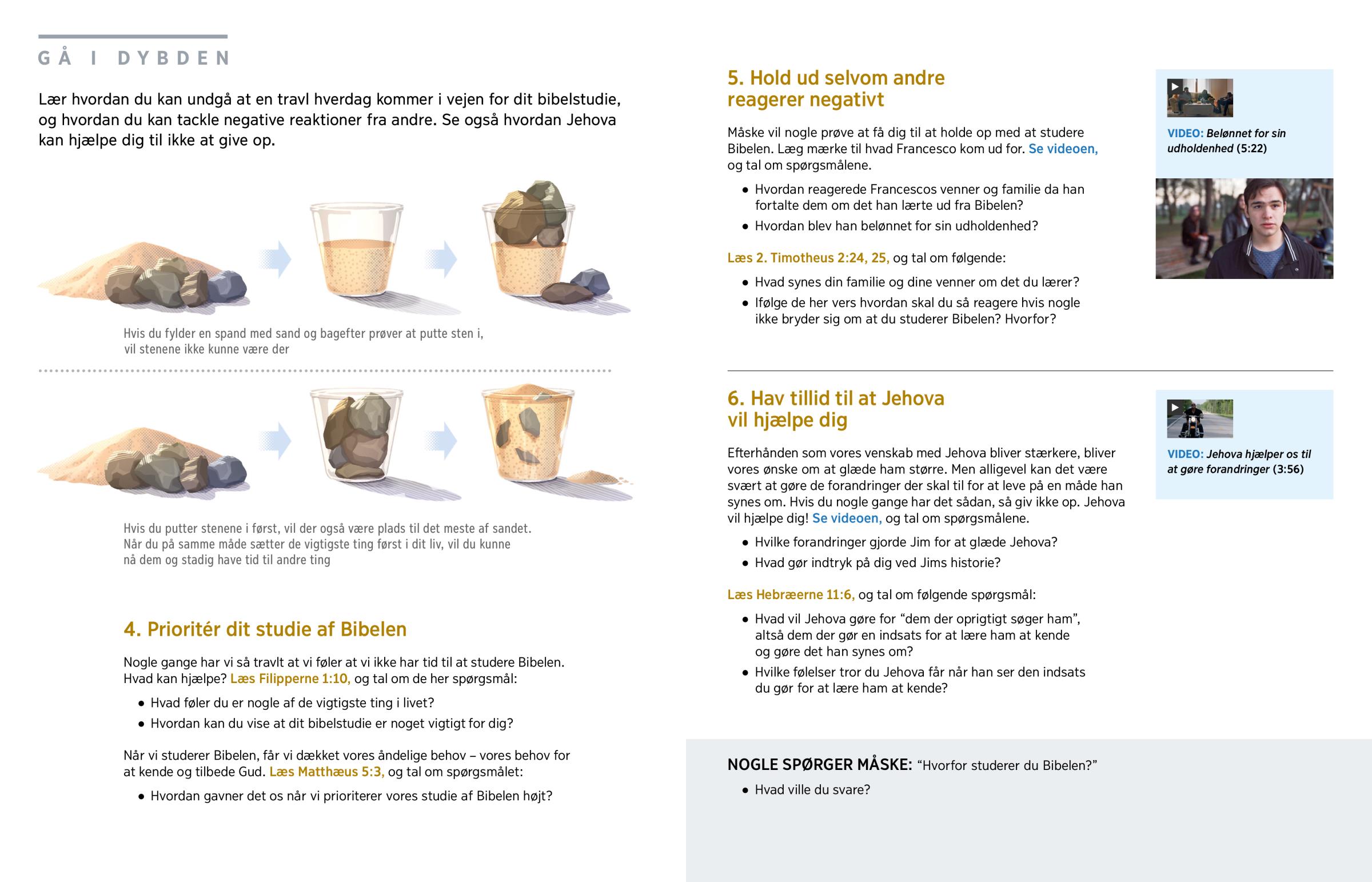 Lær hvordan du kan undgå at en travl hverdag kommer i vejen for dit bibelstudie, og hvordan du kan tackle negative reaktioner fra andre. Se også hvordan Jehova kan hjælpe dig til ikke at give op.