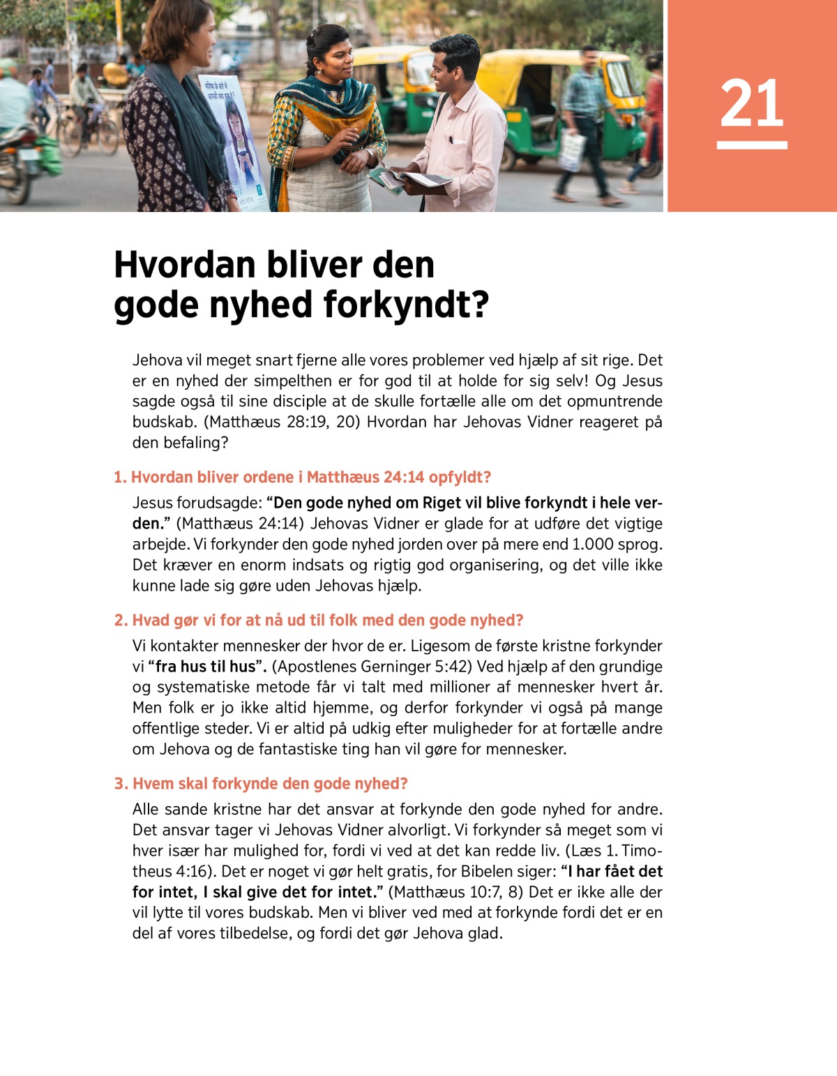 Jesus forudsagde: “Den gode nyhed om Riget vil blive forkyndt i hele verden.” (Matthæus 24:14) Jehovas Vidner er glade for at udføre det vigtige arbejde. Vi forkynder den gode nyhed jorden over på mere end 1.000 sprog. Det kræver en enorm indsats og rigtig god organisering, og det ville ikke kunne lade sig gøre uden Jehovas hjælp.