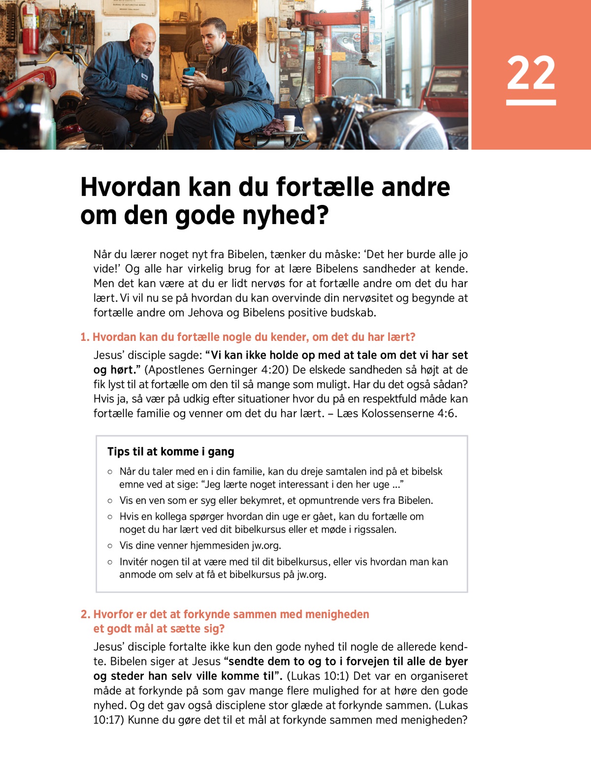 Jesus’ disciple sagde: “Vi kan ikke holde op med at tale om det vi har set og hørt.” (Apostlenes Gerninger 4:20) De elskede sandheden så højt at de fik lyst til at fortælle om den til så mange som muligt. Har du det også sådan? Hvis ja, så vær på udkig efter situationer hvor du på en respektfuld måde kan fortælle familie og venner om det du har lært. – Læs Kolossenserne 4:6.