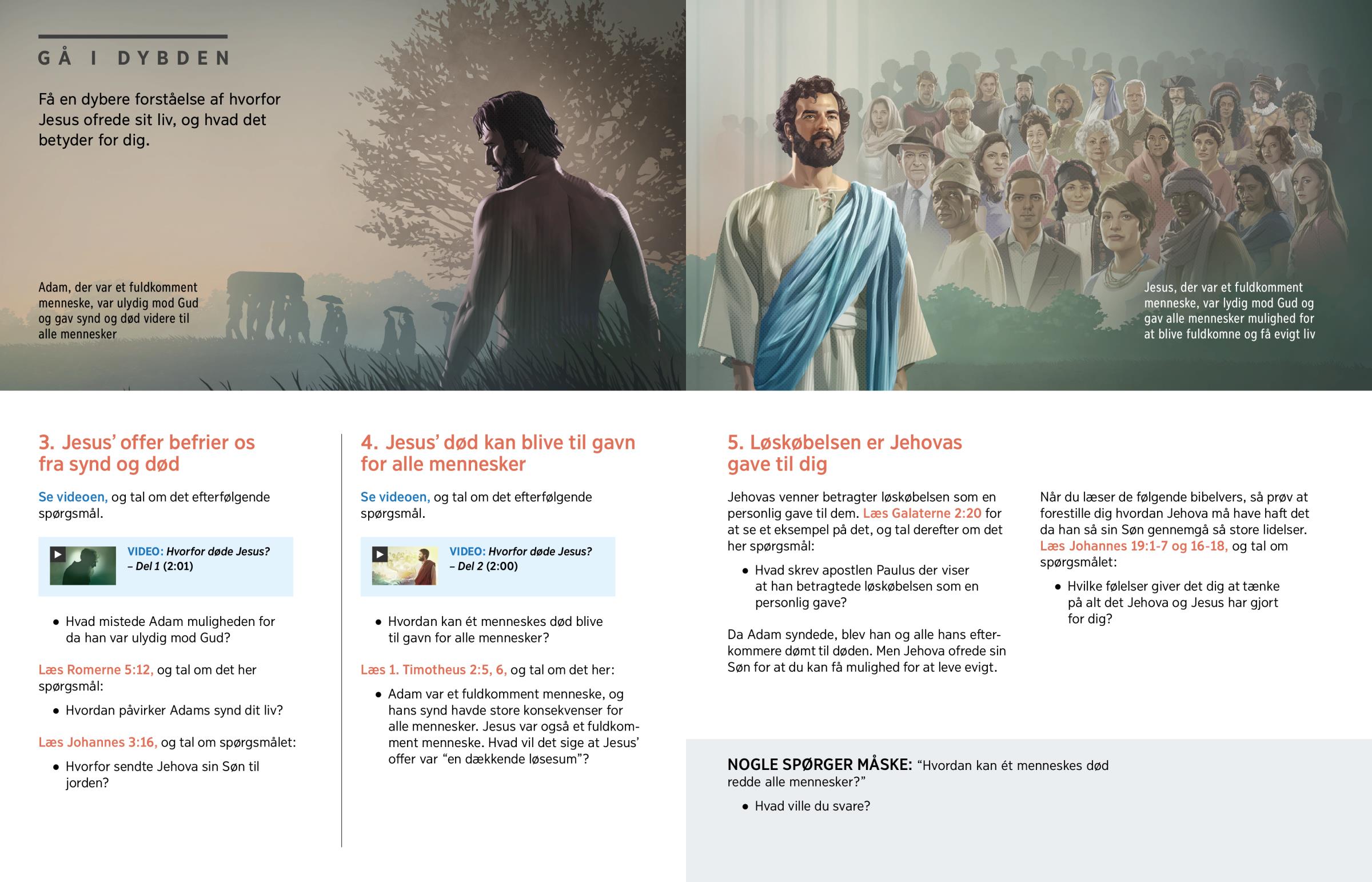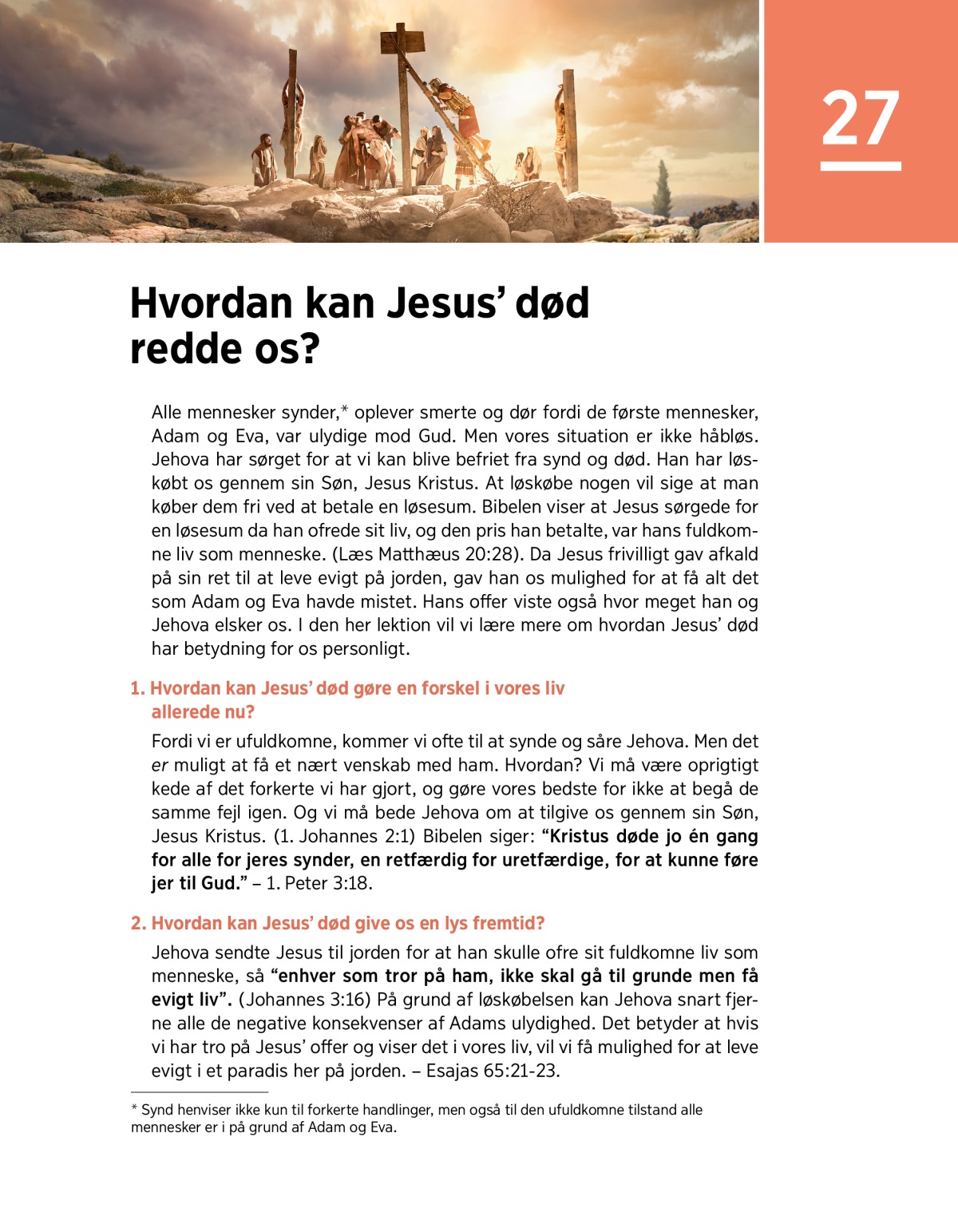 Alle mennesker synder,a oplever smerte og dør fordi de første mennesker, Adam og Eva, var ulydige mod Gud. Men vores situation er ikke håbløs. Jehova har sørget for at vi kan blive befriet fra synd og død. Han har løskøbt os gennem sin Søn, Jesus Kristus. At løskøbe nogen vil sige at man køber dem fri ved at betale en løsesum. Bibelen viser at Jesus sørgede for en løsesum da han ofrede sit liv, og den pris han betalte, var hans fuldkomne liv som menneske. (Læs Matthæus 20:28). Da Jesus frivilligt gav afkald på sin ret til at leve evigt på jorden, gav han os mulighed for at få alt det som Adam og Eva havde mistet. Hans offer viste også hvor meget han og Jehova elsker os. I den her lektion vil vi lære mere om hvordan Jesus’ død har betydning for os personligt.