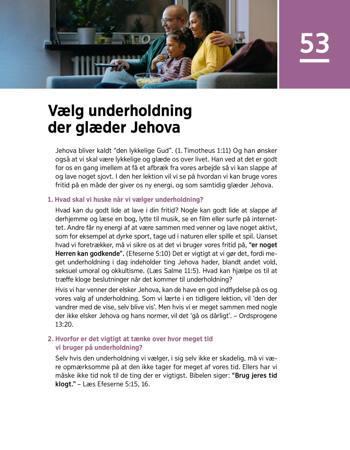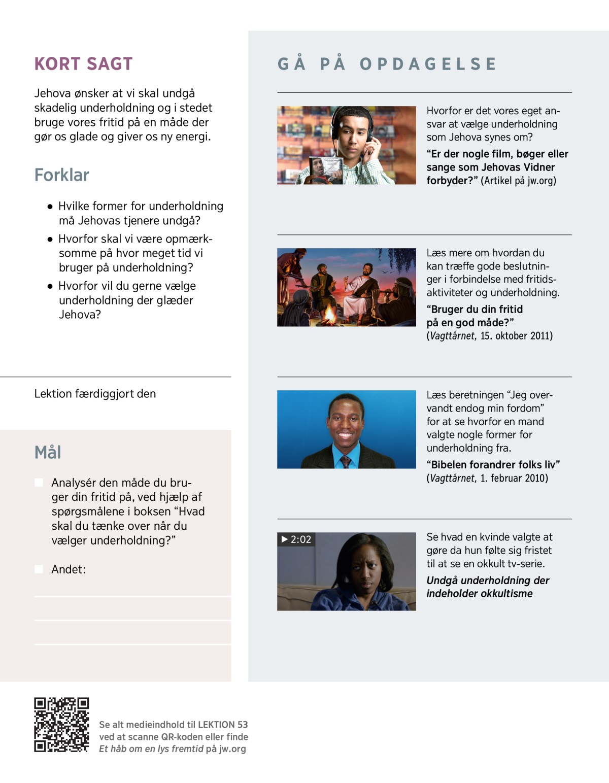 Hvad kan du godt lide at lave i din fritid? Nogle kan godt lide at slappe af derhjemme og læse en bog, lytte til musik, se en film eller surfe på internettet. Andre får ny energi af at være sammen med venner og lave noget aktivt, som for eksempel at dyrke sport, tage ud i naturen eller spille et spil. Uanset hvad vi foretrækker, må vi sikre os at det vi bruger vores fritid på, “er noget Herren kan godkende”. (Efeserne 5:10) Det er vigtigt at vi gør det, fordi meget underholdning i dag indeholder ting Jehova hader, blandt andet vold, seksuel umoral og okkultisme. (Læs Salme 11:5). Hvad kan hjælpe os til at træffe kloge beslutninger når det kommer til underholdning?