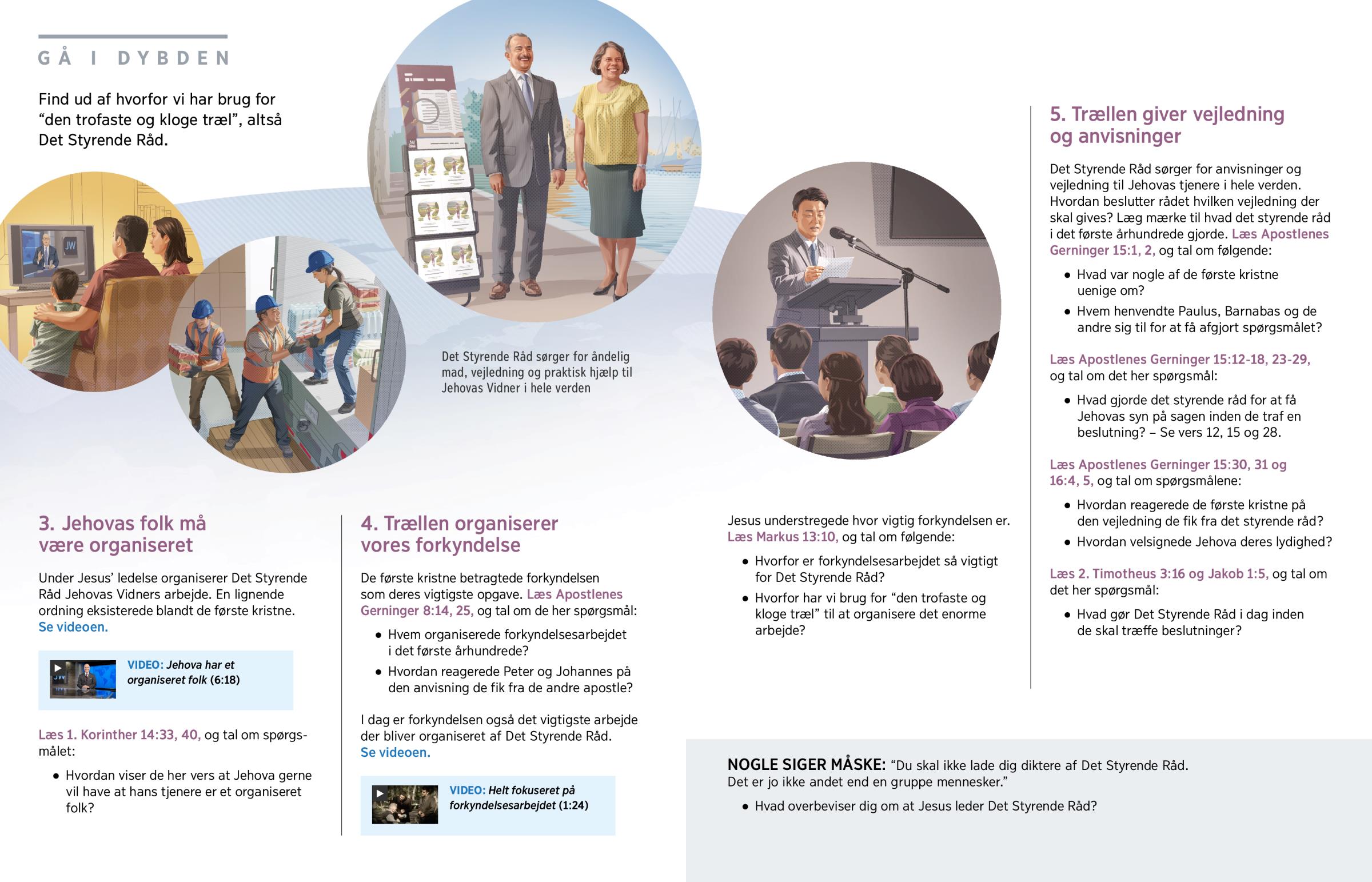Jehova har altid givet sit folk vejledning og instrukser gennem enkeltpersoner eller en lille gruppe mænd. (Malakias 2:7; Hebræerne 1:1) Efter Jesus’ død var det apostlene og de ældste i Jerusalem der førte an blandt Jehovas tjenere. (Apostlenes Gerninger 15:2) I dag er det også en lille gruppe ældste – Jehovas Vidners Styrende Råd – der sørger for åndelig mad til Jehovas tjenere og leder forkyndelsesarbejdet. Det er den gruppe der udgør “den trofaste og kloge træl” som Jesus har udnævnt. (Matthæus 24:45a) Alle medlemmerne af Det Styrende Råd er salvet med hellig ånd og har håb om at komme til at regere sammen med Kristus i himlen når deres liv på jorden er slut.