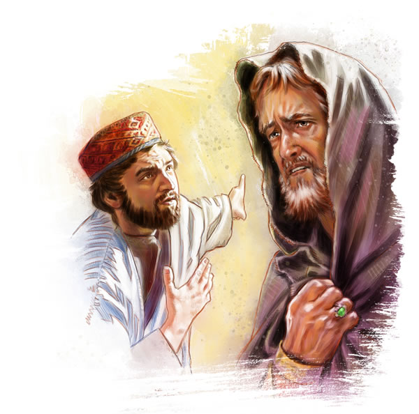 Så sagde Ziba til David at grunden til at Mefibosjet ikke var taget med, var at Mefibosjet selv ville være konge. Det var ikke rigtigt, men David troede på det! Så han gav Ziba alt hvad Mefibosjet ejede. Ikke lang tid efter vandt David krigen mod Absalom og vendte tilbage til Jerusalem. Nu kunne David så høre Mefibosjets side af historien. David besluttede at Mefibosjet og Ziba skulle dele det hele. Hvad tror du Mefibosjet nu gjorde? —