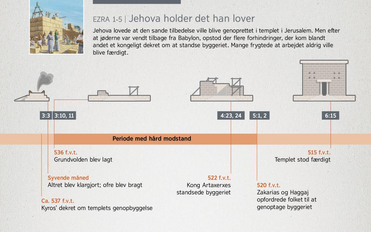 Jehova lovede at den sande tilbedelse ville blive genoprettet i templet i Jerusalem. Men efter at jøderne var vendt tilbage fra Babylon, opstod der flere forhindringer, der kom blandt andet et kongeligt dekret om at standse byggeriet. Mange frygtede at arbejdet aldrig ville blive færdigt.