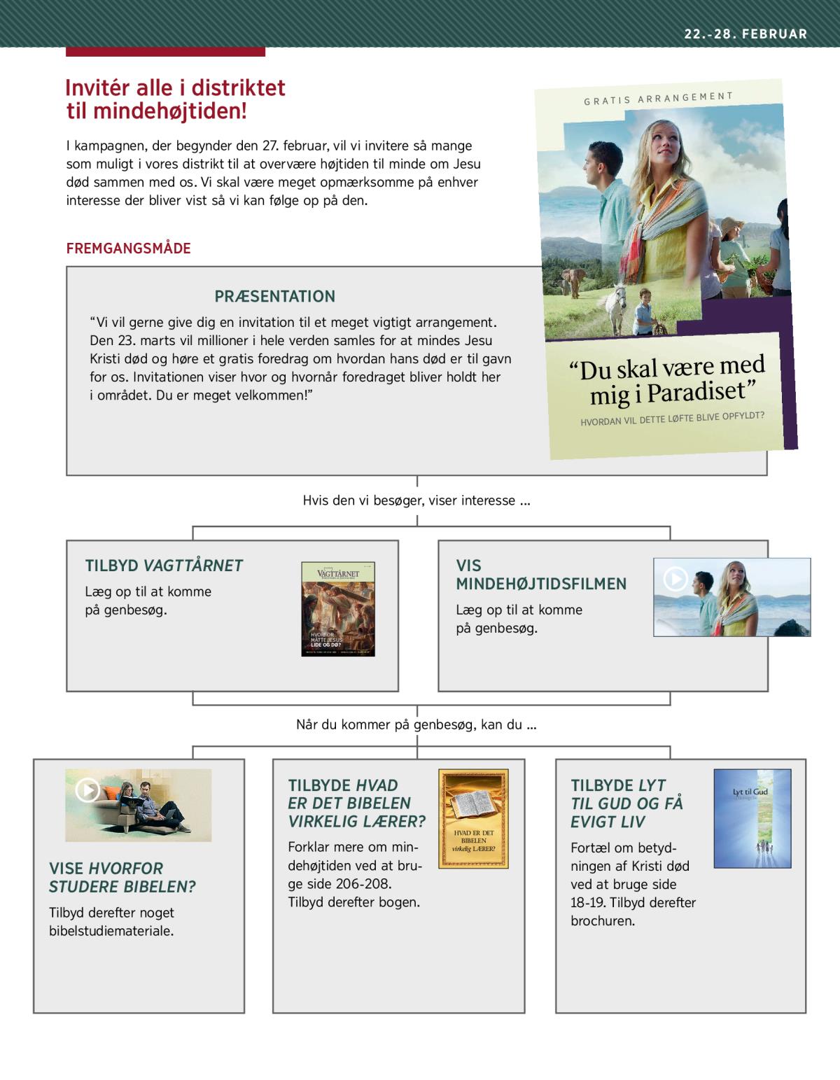 I kampagnen, der begynder den 27. februar, vil vi invitere så mange som muligt i vores distrikt til at overvære højtiden til minde om Jesu død sammen med os. Vi skal være meget opmærksomme på enhver interesse der bliver vist så vi kan følge op på den.
