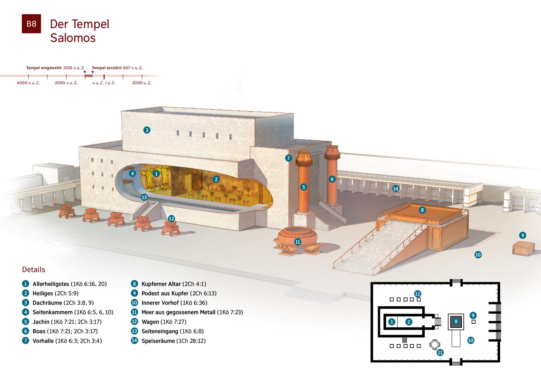 B8 Der Tempel Salomos Gedruckte Ausgabe Details 1 Allerheiligstes (1Kö 6:16, 20) 2 Heiliges (2Ch 5:9) 3 Dachräume (2Ch 3:8, 9) 4 Seitenkammern (1Kö 6:5, 6, 10) 5 Jachin (1Kö 7:21; 2Ch 3:17) 6 Boas (1Kö 7:21; 2Ch 3:17) 7 Vorhalle (1Kö 6:3; 2Ch 3:4) 8 Kupferner Altar (2Ch 4:1) 9 Podest aus Kupfer (2Ch 6:13) 10 Innerer Vorhof (1Kö 6:36) 11 Meer aus gegossenem Metall (1Kö 7:23) 12 Wagen (1Kö 7:27) 13 Seiteneingang (1Kö 6:8) 14 Speiseräume (1Ch 28:12)