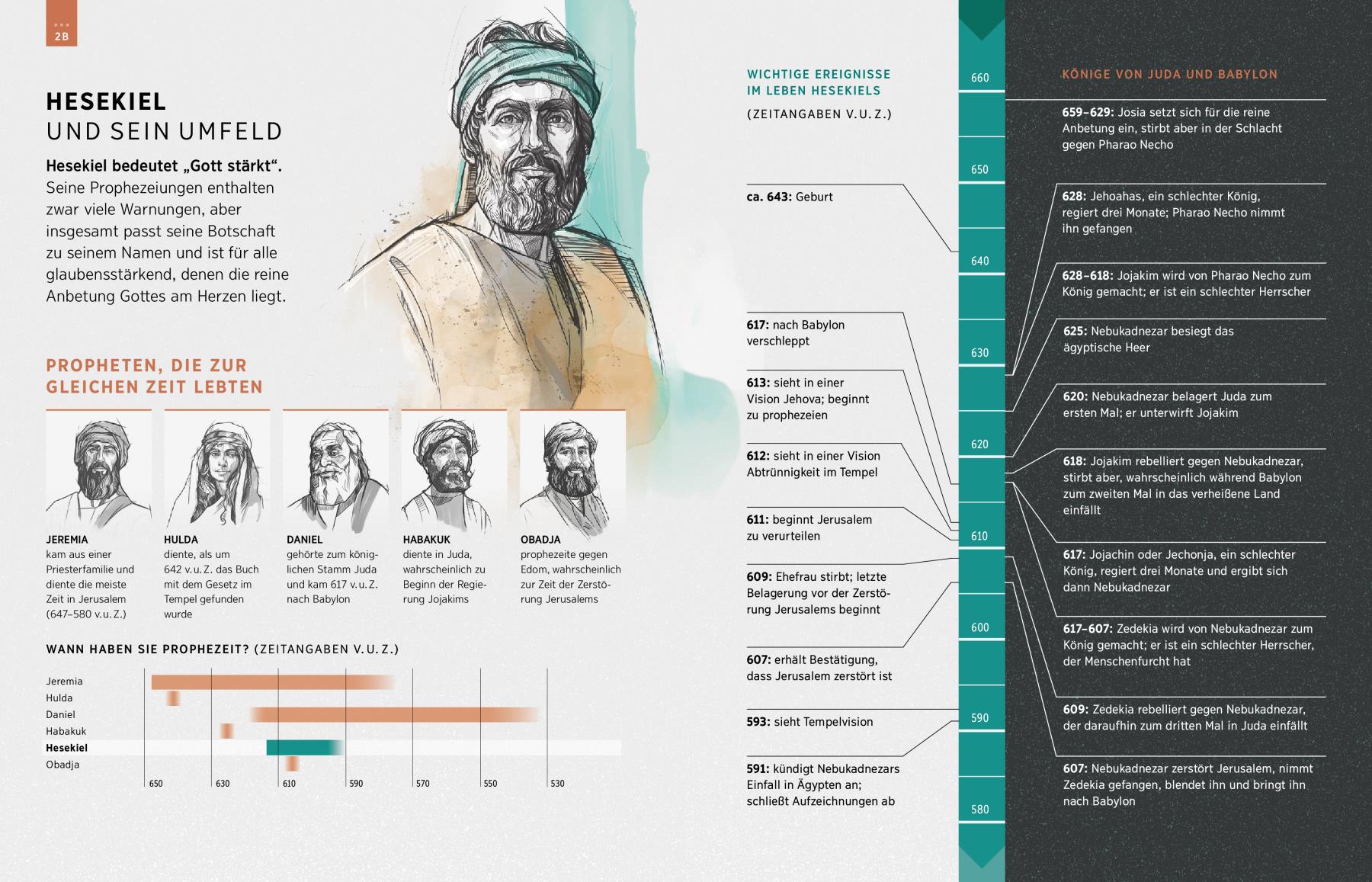 Diese Übersicht zeigt, wer zur Zeit Hesekiels als Prophet diente (alle Daten sind v. u. Z.). Jeremia: von 647 bis ca. 580; Hulda: ca. 642; Daniel: von ca. 617 bis ca. 537; Habakuk: ca. 625; Hesekiel: von 613 bis ca. 591; Obadja: ca. 607.