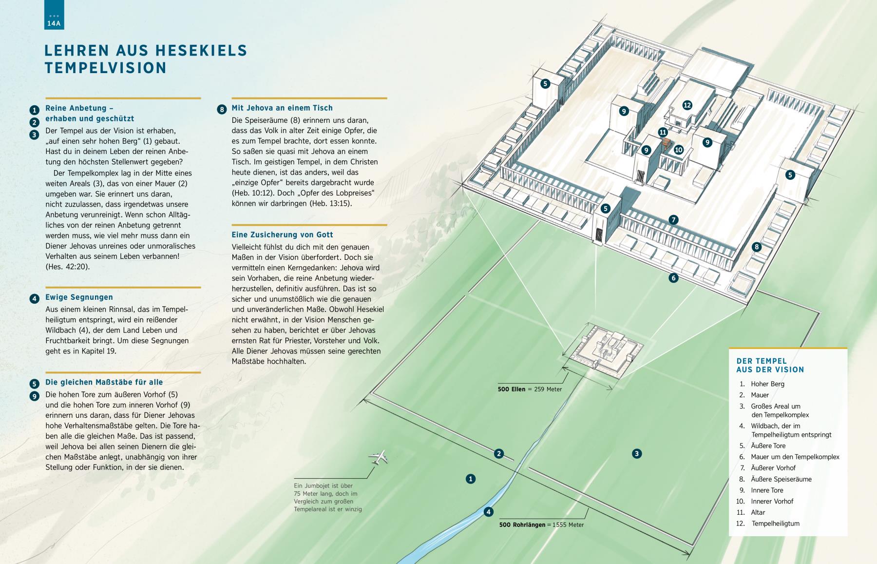 Eine Darstellung mit wichtigen Merkmalen des Tempels aus Hesekiels Vision. Dazu gehören: 1. Hoher Berg. 2. Mauer. 3. Großes Areal um den Tempelkomplex. 4. Wildbach, der im Tempelheiligtum entspringt. 5. Äußere Tore. 6. Mauer um den Tempelkomplex. 7. Äußerer Vorhof. 8. Äußere Speiseräume. 9. Innere Tore. 10. Innerer Vorhof. 11. Altar. 12. Tempelheiligtum. Ein Jumbojet (über 75 Meter lang) ist maßstabsgetreu dargestellt und winzig im Vergleich zu den Mauern an jeder Seite des Tempelareals (jeweils 1 555 Meter lang).