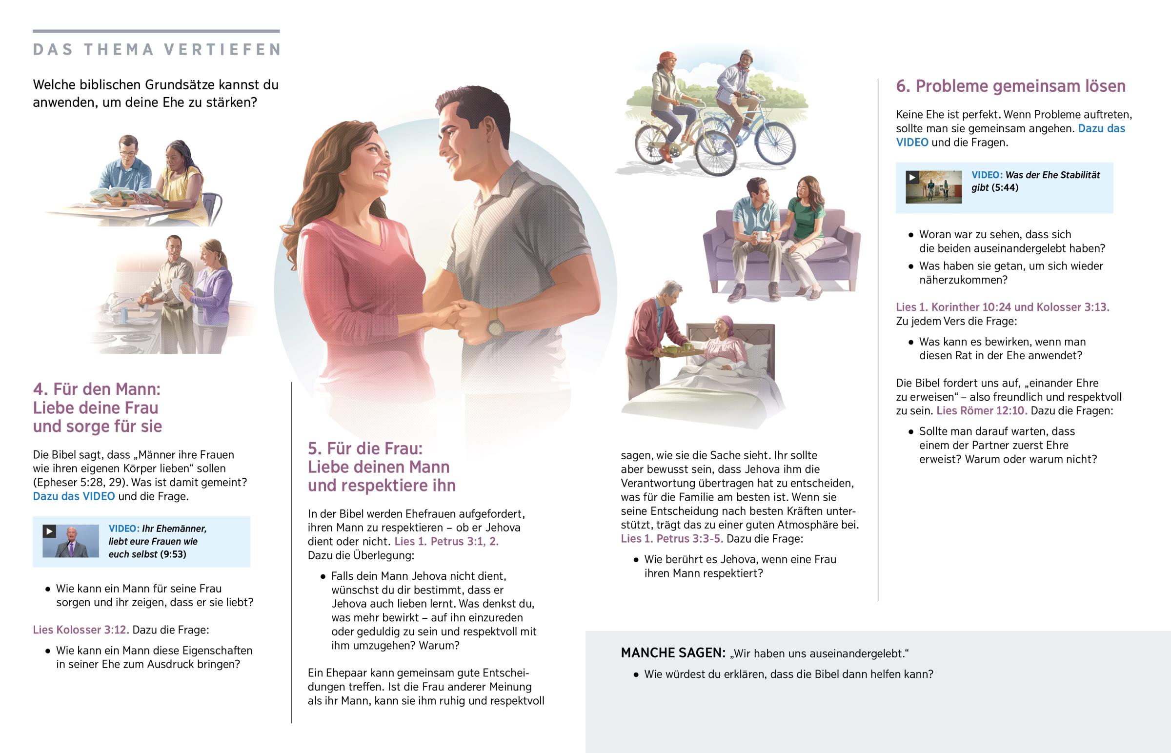 Jehova hat dem Mann die Verantwortung für die Familie übertragen. (Lies Epheser 5:23.) Jehova erwartet von ihm, dass er Entscheidungen trifft, die gut für die Familie sind. Die Bibel rät Ehemännern: „Liebt eure Frauen weiterhin“ (Epheser 5:25). Was bedeutet das im Alltag? Ein Mann sollte immer liebevoll und freundlich mit seiner Frau umgehen, egal ob zu Hause oder in der Öffentlichkeit. Er sorgt sich um ihre Sicherheit und kümmert sich um ihre materiellen und emotionalen Bedürfnisse (1. Timotheus 5:8). Und vor allem hilft er seiner Frau, im Glauben stark zu bleiben (Matthäus 4:4). Er liest zum Beispiel mit ihr in der Bibel und betet mit ihr. Kümmert sich ein Mann liebevoll um seine Frau, bleibt auch sein Verhältnis zu Jehova intakt. (Lies 1. Petrus 3:7.)