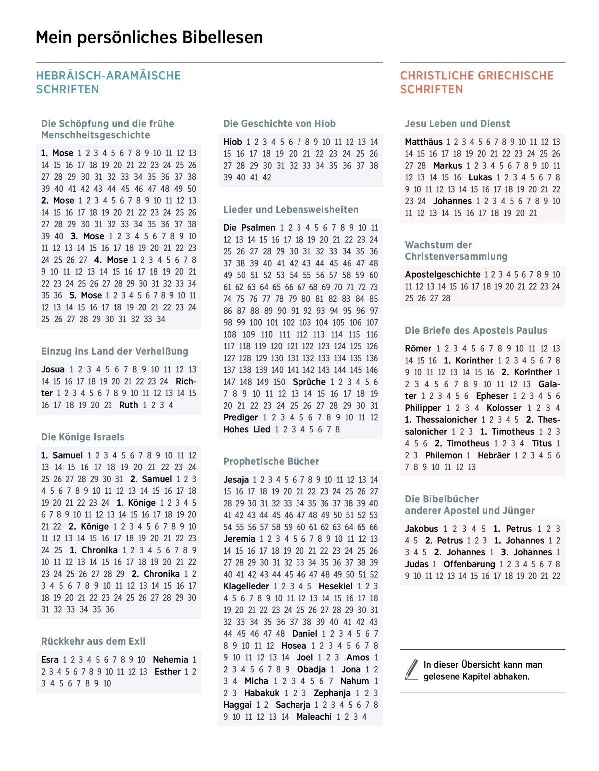 Mein persönliches Bibellesen Gedruckte Ausgabe Die Schöpfung und die frühe Menschheitsgeschichte Einzug ins Land der Verheißung Die Könige Israels Rückkehr aus dem Exil Die Geschichte von Hiob Lieder und Lebensweisheiten Prophetische Bücher Jesu Leben und Dienst Wachstum der Christenversammlung Die Briefe des Apostels Paulus Die Bibelbücher anderer Apostel und Jünger In dieser Übersicht kann man gelesene Kapitel abhaken. HEBRÄISCH-ARAMÄISCHE SCHRIFTEN Die Schöpfung und die frühe Menschheitsgeschichte 1. Mose 1 2 3 4 5 6 7 8 9 10 11 12 13 14 15 16 17 18 19 20 21 22 23 24 25 26 27 28 29 30 31 32 33 34 35 36 37 38 39 40 41 42 43 44 45 46 47 48 49 50 2. Mose 1 2 3 4 5 6 7 8 9 10 11 12 13 14 15 16 17 18 19 20 21 22 23 24 25 26 27 28 29 30 31 32 33 34 35 36 37 38 39 40 3. Mose 1 2 3 4 5 6 7 8 9 10 11 12 13 14 15 16 17 18 19 20 21 22 23 24 25 26 27 4. Mose 1 2 3 4 5 6 7 8 9 10 11 12 13 14 15 16 17 18 19 20 21 22 23 24 25 26 27 28 29 30 31 32 33 34 35 36 5. Mose 1 2 3 4 5 6 7 8 9 10 11 12 13 14 15 16 17 18 19 20 21 22 23 24 25 26 27 28 29 30 31 32 33 34 Einzug ins Land der Verheißung Josua 1 2 3 4 5 6 7 8 9 10 11 12 13 14 15 16 17 18 19 20 21 22 23 24 Richter 1 2 3 4 5 6 7 8 9 10 11 12 13 14 15 16 17 18 19 20 21 Ruth 1 2 3 4 Die Könige Israels 1. Samuel 1 2 3 4 5 6 7 8 9 10 11 12 13 14 15 16 17 18 19 20 21 22 23 24 25 26 27 28 29 30 31 2. Samuel 1 2 3 4 5 6 7 8 9 10 11 12 13 14 15 16 17 18 19 20 21 22 23 24 1. Könige 1 2 3 4 5 6 7 8 9 10 11 12 13 14 15 16 17 18 19 20 21 22 2. Könige 1 2 3 4 5 6 7 8 9 10 11 12 13 14 15 16 17 18 19 20 21 22 23 24 25 1. Chronika 1 2 3 4 5 6 7 8 9 10 11 12 13 14 15 16 17 18 19 20 21 22 23 24 25 26 27 28 29 2. Chronika 1 2 3 4 5 6 7 8 9 10 11 12 13 14 15 16 17 18 19 20 21 22 23 24 25 26 27 28 29 30 31 32 33 34 35 36 Rückkehr aus dem Exil Esra 1 2 3 4 5 6 7 8 9 10 Nehemia 1 2 3 4 5 6 7 8 9 10 11 12 13 Esther 1 2 3 4 5 6 7 8 9 10 Die Geschichte von Hiob Hiob 1 2 3 4 5 6 7 8 9 10 11 12 13 14 15 16 17 18 19 20 21 22 23 24 25 26 27 28 29 30 31 32 33 34 35 36 37 38 39 40 41 42 Lieder und Lebensweisheiten Die Psalmen 1 2 3 4 5 6 7 8 9 10 11 12 13 14 15 16 17 18 19 20 21 22 23 24 25 26 27 28 29 30 31 32 33 34 35 36 37 38 39 40 41 42 43 44 45 46 47 48 49 50 51 52 53 54 55 56 57 58 59 60 61 62 63 64 65 66 67 68 69 70 71 72 73 74 75 76 77 78 79 80 81 82 83 84 85 86 87 88 89 90 91 92 93 94 95 96 97 98 99 100 101 102 103 104 105 106 107 108 109 110 111 112 113 114 115 116 117 118 119 120 121 122 123 124 125 126 127 128 129 130 131 132 133 134 135 136 137 138 139 140 141 142 143 144 145 146 147 148 149 150 Sprüche 1 2 3 4 5 6 7 8 9 10 11 12 13 14 15 16 17 18 19 20 21 22 23 24 25 26 27 28 29 30 31 Prediger 1 2 3 4 5 6 7 8 9 10 11 12 Hohes Lied 1 2 3 4 5 6 7 8 Prophetische Bücher Jesaja 1 2 3 4 5 6 7 8 9 10 11 12 13 14 15 16 17 18 19 20 21 22 23 24 25 26 27 28 29 30 31 32 33 34 35 36 37 38 39 40 41 42 43 44 45 46 47 48 49 50 51 52 53 54 55 56 57 58 59 60 61 62 63 64 65 66 Jeremia 1 2 3 4 5 6 7 8 9 10 11 12 13 14 15 16 17 18 19 20 21 22 23 24 25 26 27 28 29 30 31 32 33 34 35 36 37 38 39 40 41 42 43 44 45 46 47 48 49 50 51 52 Klagelieder 1 2 3 4 5 Hesekiel 1 2 3 4 5 6 7 8 9 10 11 12 13 14 15 16 17 18 19 20 21 22 23 24 25 26 27 28 29 30 31 32 33 34 35 36 37 38 39 40 41 42 43 44 45 46 47 48 Daniel 1 2 3 4 5 6 7 8 9 10 11 12 Hosea 1 2 3 4 5 6 7 8 9 10 11 12 13 14 Joel 1 2 3 Amos 1 2 3 4 5 6 7 8 9 Obadja 1 Jona 1 2 3 4 Micha 1 2 3 4 5 6 7 Nahum 1 2 3 Habakuk 1 2 3 Zephanja 1 2 3 Haggai 1 2 Sacharja 1 2 3 4 5 6 7 8 9 10 11 12 13 14 Maleachi 1 2 3 4 CHRISTLICHE GRIECHISCHE SCHRIFTEN Jesu Leben und Dienst Matthäus 1 2 3 4 5 6 7 8 9 10 11 12 13 14 15 16 17 18 19 20 21 22 23 24 25 26 27 28 Markus 1 2 3 4 5 6 7 8 9 10 11 12 13 14 15 16 Lukas 1 2 3 4 5 6 7 8 9 10 11 12 13 14 15 16 17 18 19 20 21 22 23 24 Johannes 1 2 3 4 5 6 7 8 9 10 11 12 13 14 15 16 17 18 19 20 21 Wachstum der Christenversammlung Apostelgeschichte 1 2 3 4 5 6 7 8 9 10 11 12 13 14 15 16 17 18 19 20 21 22 23 24 25 26 27 28 Die Briefe des Apostels Paulus Römer 1 2 3 4 5 6 7 8 9 10 11 12 13 14 15 16 1. Korinther 1 2 3 4 5 6 7 8 9 10 11 12 13 14 15 16 2. Korinther 1 2 3 4 5 6 7 8 9 10 11 12 13 Galater 1 2 3 4 5 6 Epheser 1 2 3 4 5 6 Philipper 1 2 3 4 Kolosser 1 2 3 4 1. Thessalonicher 1 2 3 4 5 2. Thessalonicher 1 2 3 1. Timotheus 1 2 3 4 5 6 2. Timotheus 1 2 3 4 Titus 1 2 3 Philemon 1 Hebräer 1 2 3 4 5 6 7 8 9 10 11 12 13 Die Bibelbücher anderer Apostel und Jünger Jakobus 1 2 3 4 5 1. Petrus 1 2 3 4 5 2. Petrus 1 2 3 1. Johannes 1 2 3 4 5 2. Johannes 1 3. Johannes 1 Judas 1 Offenbarung 1 2 3 4 5 6 7 8 9 10 11 12 13 14 15 16 17 18 19 20 21 22