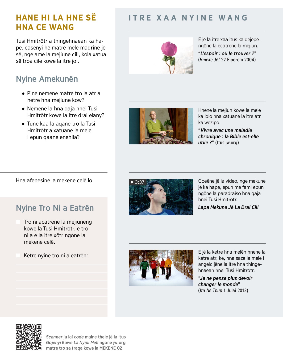 “Pë hmaca kö mec, me hleuhleu, me treij, me akötr.” (E jë la Hna Amaman 21:4.) Matre ame la itre jol ka ahacene la mele së tune la pë mo, me itre thiina ka tha meköti kö, me itre sine kucakuca, me mec, ke tro ha patr. Tusi Hmitrötr a qaja ka hape, tro la itre atr a mele madrin uti hë epin ngöne la paradraiso e celë fen.