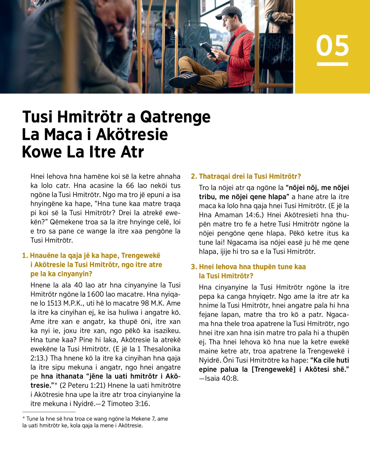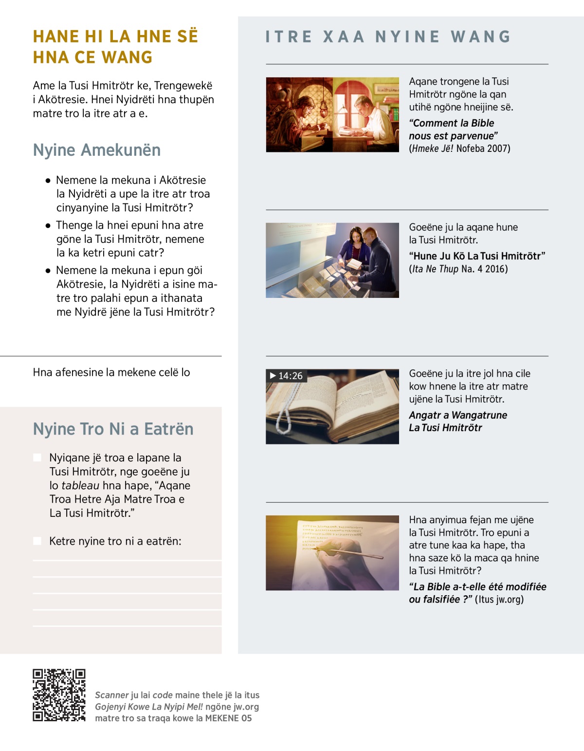 Hnei Iehova hna hamëne koi së la ketre ahnaha ka lolo catr. Hna acasine la 66 lao neköi tus ngöne la Tusi Hmitrötr. Ngo ma tro jë epuni a isa hnyingëne ka hape, “Hna tune kaa matre traqa pi koi së la Tusi Hmitrötr? Drei la atrekë ewekën?” Qëmekene troa sa la itre hnyinge celë, loi e tro sa pane ce wange la itre xaa pengöne la Tusi Hmitrötr.
