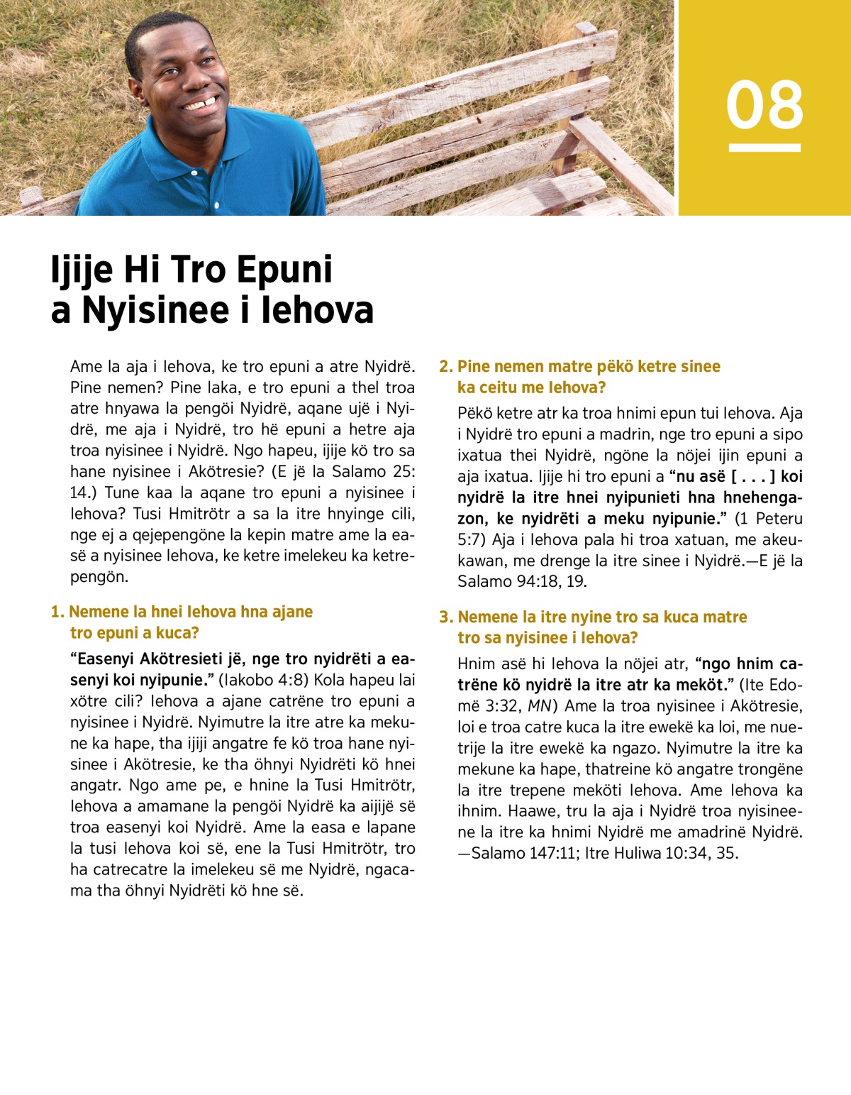 Ame la aja i Iehova, ke tro epuni a atre Nyidrë. Pine nemen? Pine laka, e tro epuni a thel troa atre hnyawa la pengöi Nyidrë, aqane ujë i Nyidrë, me aja i Nyidrë, tro hë epuni a hetre aja troa nyisinee i Nyidrë. Ngo hapeu, ijije kö tro sa hane nyisinee i Akötresie? (E jë la Salamo 25:14.) Tune kaa la aqane tro epuni a nyisinee i Iehova? Tusi Hmitrötr a sa la itre hnyinge cili, nge ej a qejepengöne la kepin matre ame la easë a nyisinee Iehova, ke ketre imelekeu ka ketrepengön.