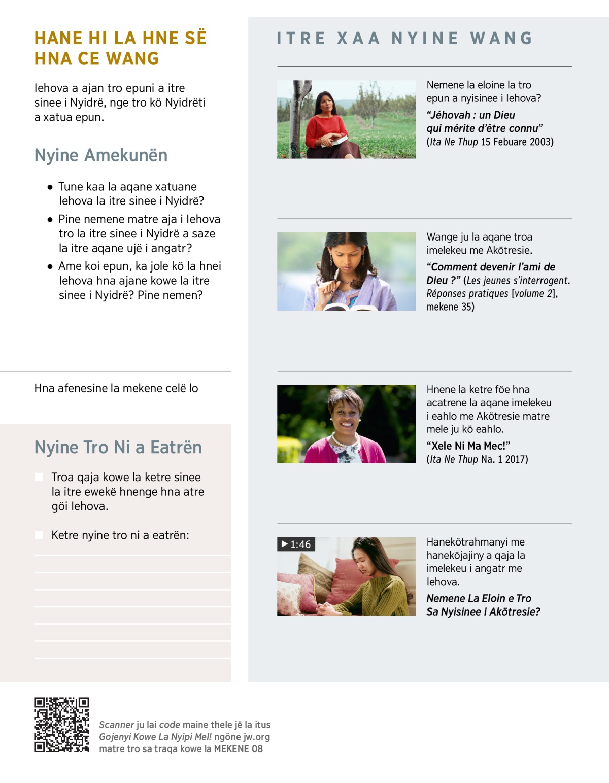 “Easenyi Akötresieti jë, nge tro nyidrëti a easenyi koi nyipunie.” (Iakobo 4:8) Kola hapeu lai xötre cili? Iehova a ajane catrëne tro epuni a nyisinee i Nyidrë. Nyimutre la itre atre ka mekune ka hape, tha ijiji angatre fe kö troa hane nyisinee i Akötresie, ke tha öhnyi Nyidrëti kö hnei angatr. Ngo ame pe, e hnine la Tusi Hmitrötr, Iehova a amamane la pengöi Nyidrë ka aijijë së troa easenyi koi Nyidrë. Ame la easa e lapane la tusi Iehova koi së, ene la Tusi Hmitrötr, tro ha catrecatre la imelekeu së me Nyidrë, ngacama tha öhnyi Nyidrëti kö hne së.