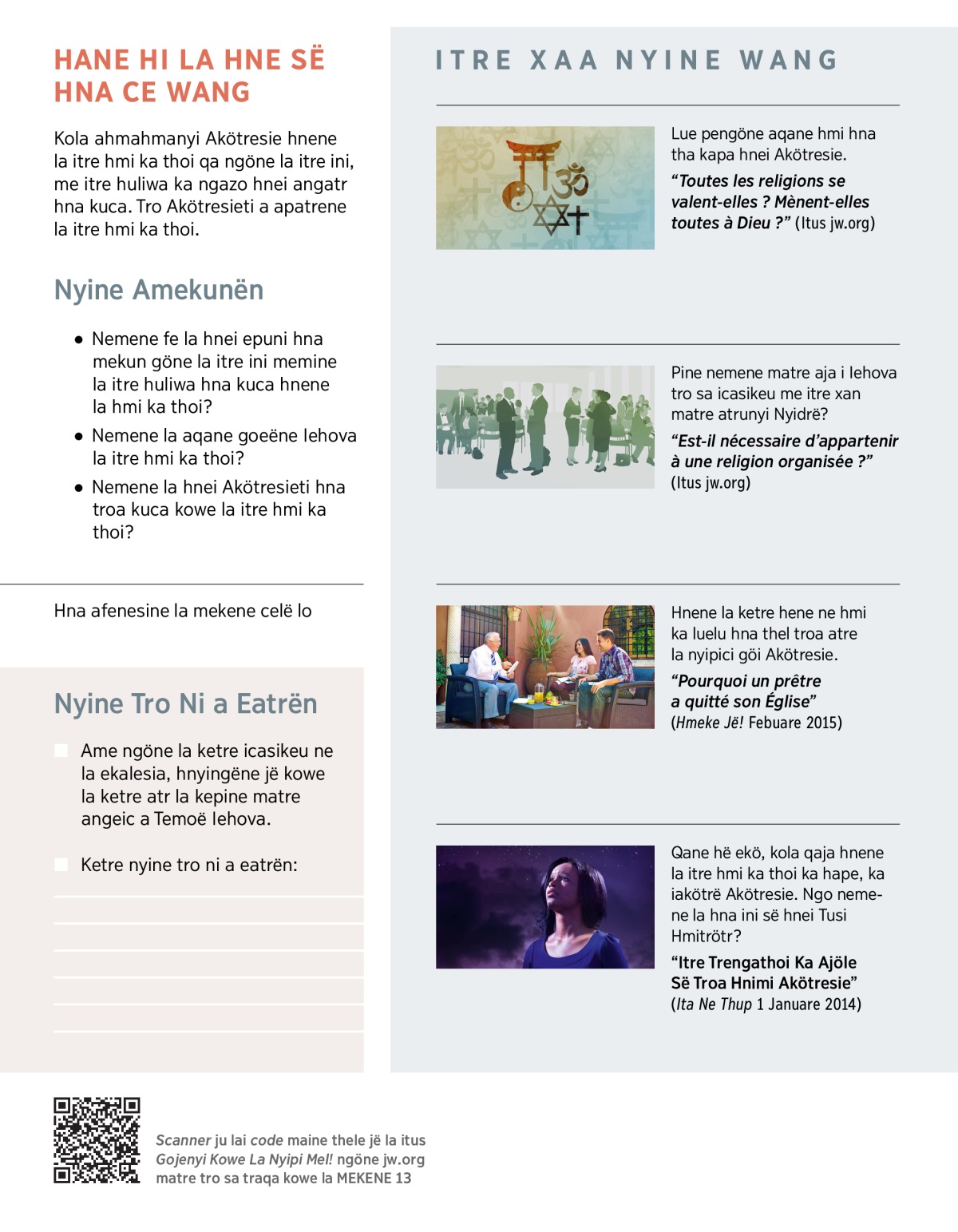 Hnene la hmi ka thoi hna “nyihnane la nyipici i Akötresie troa hnine la thoi.” (Roma 1:25) Tune la ëje i Akötresie, tha hnene kö la itre hmi hna qaja kowe la itre atr. Ngo ame pe, hnei Tusi Hmitrötr hna qaja la enyipiewekën troa hëne la ëje i Akötresie. (Roma 10:13, 14) Ketre, itre xaa hene ne hmi a qaja ka hape, ame la kola traqa la hulö, ke zöi Akötresie. Ngo trengathoi lai. Thatreine kö tupathi Akötresie hnene la itre ewekë ka ngazo. (E jë la Iakobo 1:13.) Celë hi matre, hnene la itre trengathoi cili hna ananyine la itre atr qaathei Akötresie.