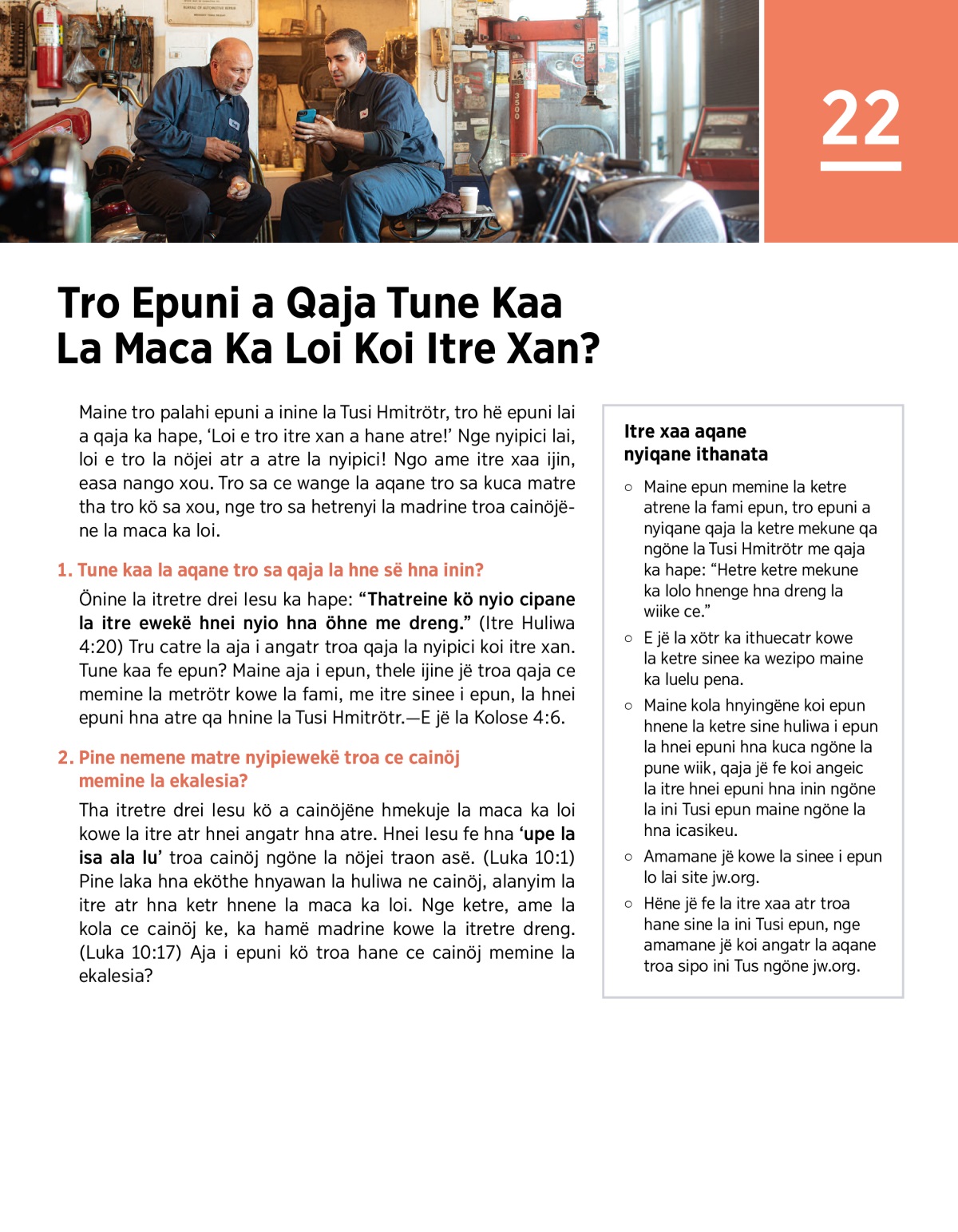 Önine la itretre drei Iesu ka hape: “Thatreine kö nyio cipane la itre ewekë hnei nyio hna öhne me dreng.” (Itre Huliwa 4:20) Tru catre la aja i angatr troa qaja la nyipici koi itre xan. Tune kaa fe epun? Maine aja i epun, thele ijine jë troa qaja ce memine la metrötr kowe la fami, me itre sinee i epun, la hnei epuni hna atre qa hnine la Tusi Hmitrötr.—E jë la Kolose 4:6.