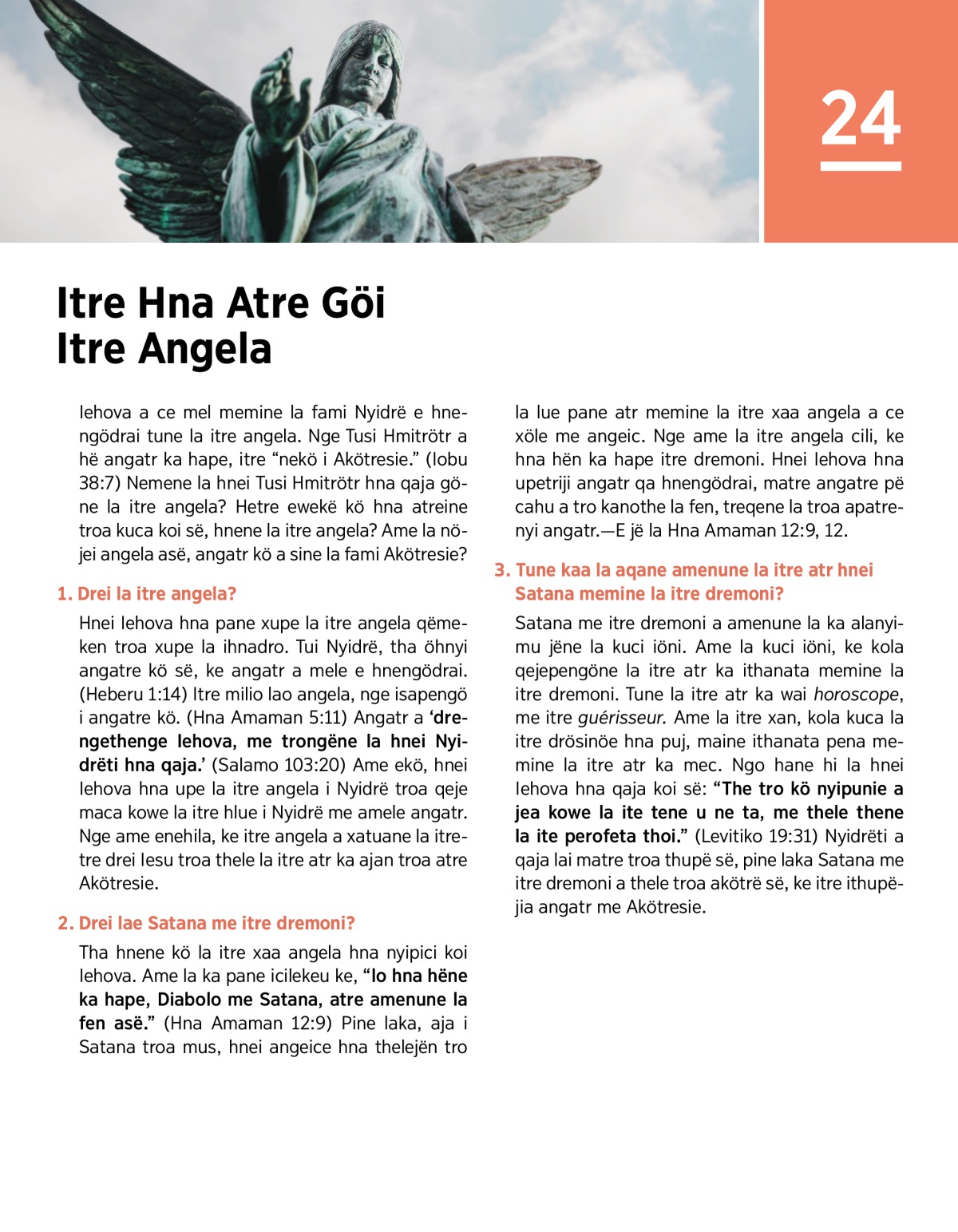 Hnei Iehova hna pane xupe la itre angela qëmeken troa xupe la ihnadro. Tui Nyidrë, tha öhnyi angatre kö së, ke angatr a mele e hnengödrai. (Heberu 1:14) Itre milio lao angela, nge isapengö i angatre kö. (Hna Amaman 5:11) Angatr a ‘drengethenge Iehova, me trongëne la hnei Nyidrëti hna qaja.’ (Salamo 103:20) Ame ekö, hnei Iehova hna upe la itre angela i Nyidrë troa qeje maca kowe la itre hlue i Nyidrë me amele angatr. Nge ame enehila, ke itre angela a xatuane la itretre drei Iesu troa thele la itre atr ka ajan troa atre Akötresie.