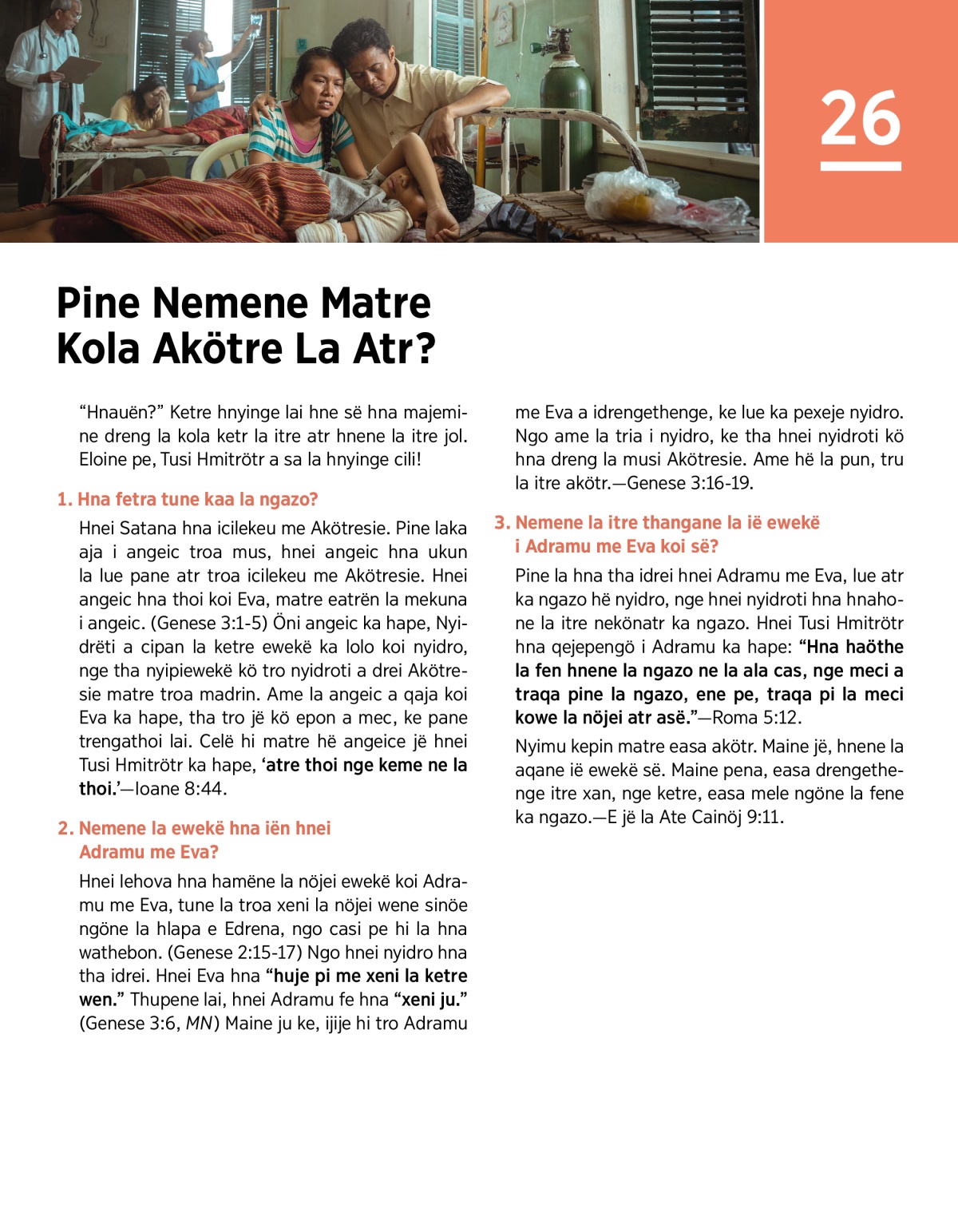 Hnei Iehova hna hamëne la nöjei ewekë koi Adramu me Eva, tune la troa xeni la nöjei wene sinöe ngöne la hlapa e Edrena, ngo casi pe hi la hna wathebon. (Genese 2:15-17) Ngo hnei nyidro hna tha idrei. Hnei Eva hna “huje pi me xeni la ketre wen.” Thupene lai, hnei Adramu fe hna “xeni ju.” (Genese 3:6, MN) Maine ju ke, ijije hi tro Adramu me Eva a idrengethenge, ke lue ka pexeje nyidro. Ngo ame la tria i nyidro, ke tha hnei nyidroti kö hna dreng la musi Akötresie. Ame hë la pun, tru la itre akötr.—Genese 3:16-19.
