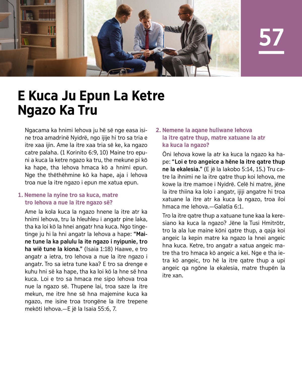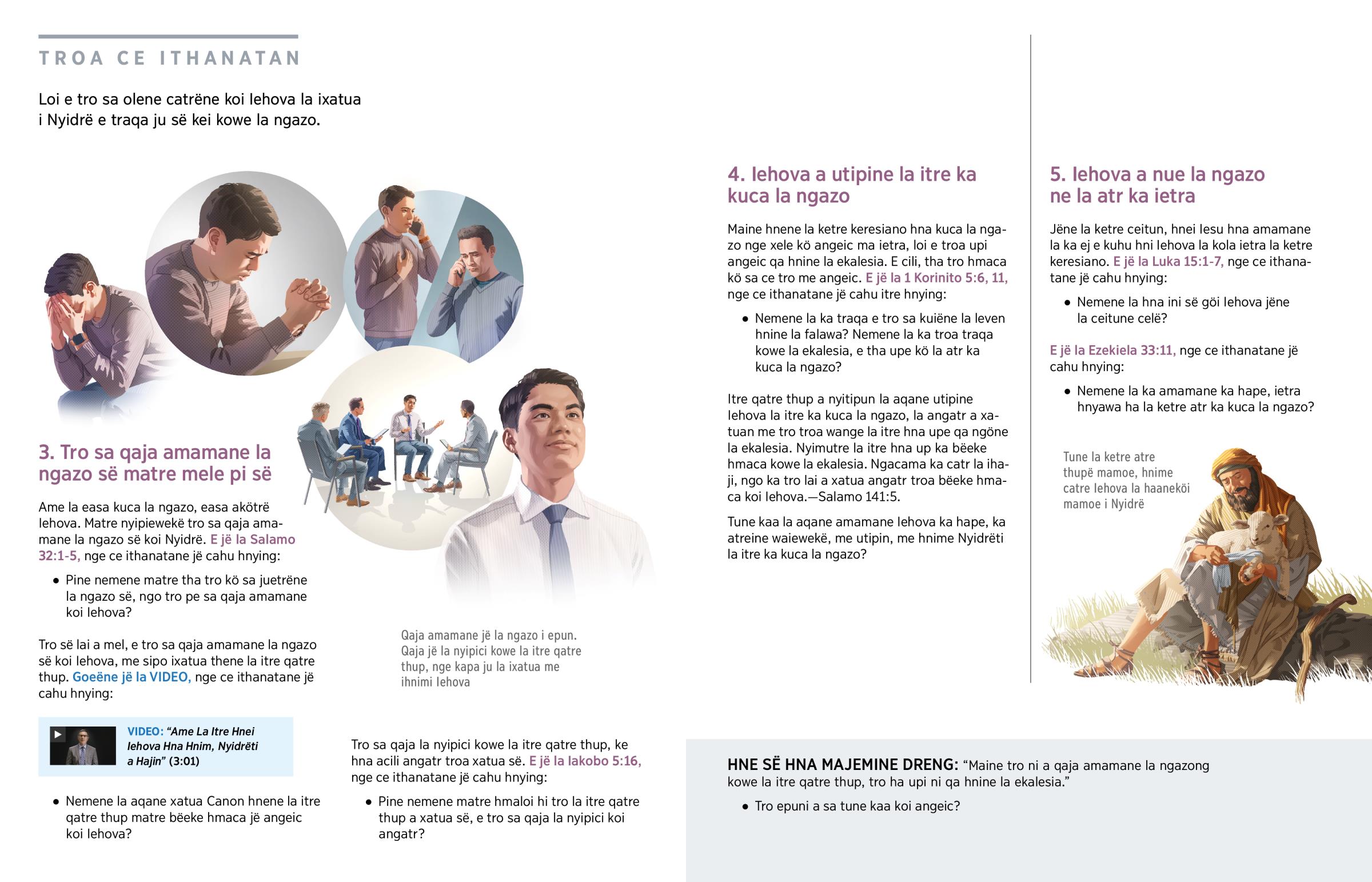 Öni Iehova kowe la atr ka kuca la ngazo ka hape: “Loi e tro angeice a hëne la itre qatre thup ne la ekalesia.” (E jë la Iakobo 5:14, 15.) Tru catre la ihnimi ne la itre qatre thup koi Iehova, me kowe la itre mamoe i Nyidrë. Celë hi matre, jëne la itre thiina ka lolo i angatr, ijiji angatre hi troa xatuane la itre atr ka kuca la ngazo, troa iloi hmaca me Iehova.—Galatia 6:1.