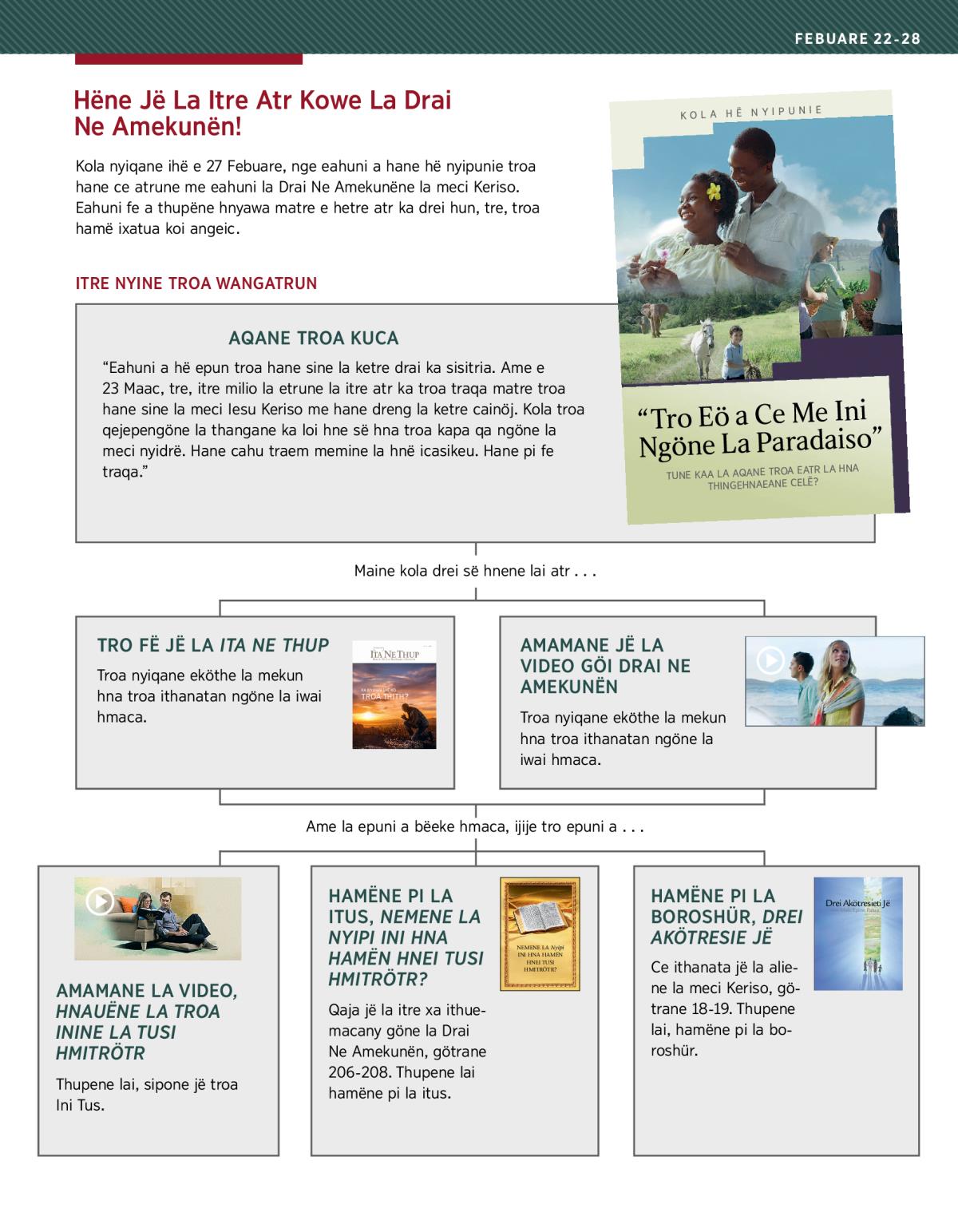 “Eahuni a hë epun troa hane sine la ketre drai ka sisitria. Ame e 23 Maac, tre, itre milio la etrune la itre atr ka troa traqa matre troa hane sine la meci Iesu Keriso me hane dreng la ketre cainöj. Kola troa qejepengöne la thangane ka loi hne së hna troa kapa qa ngöne la meci nyidrë. Hane cahu traem memine la hnë icasikeu. Hane pi fe traqa.”