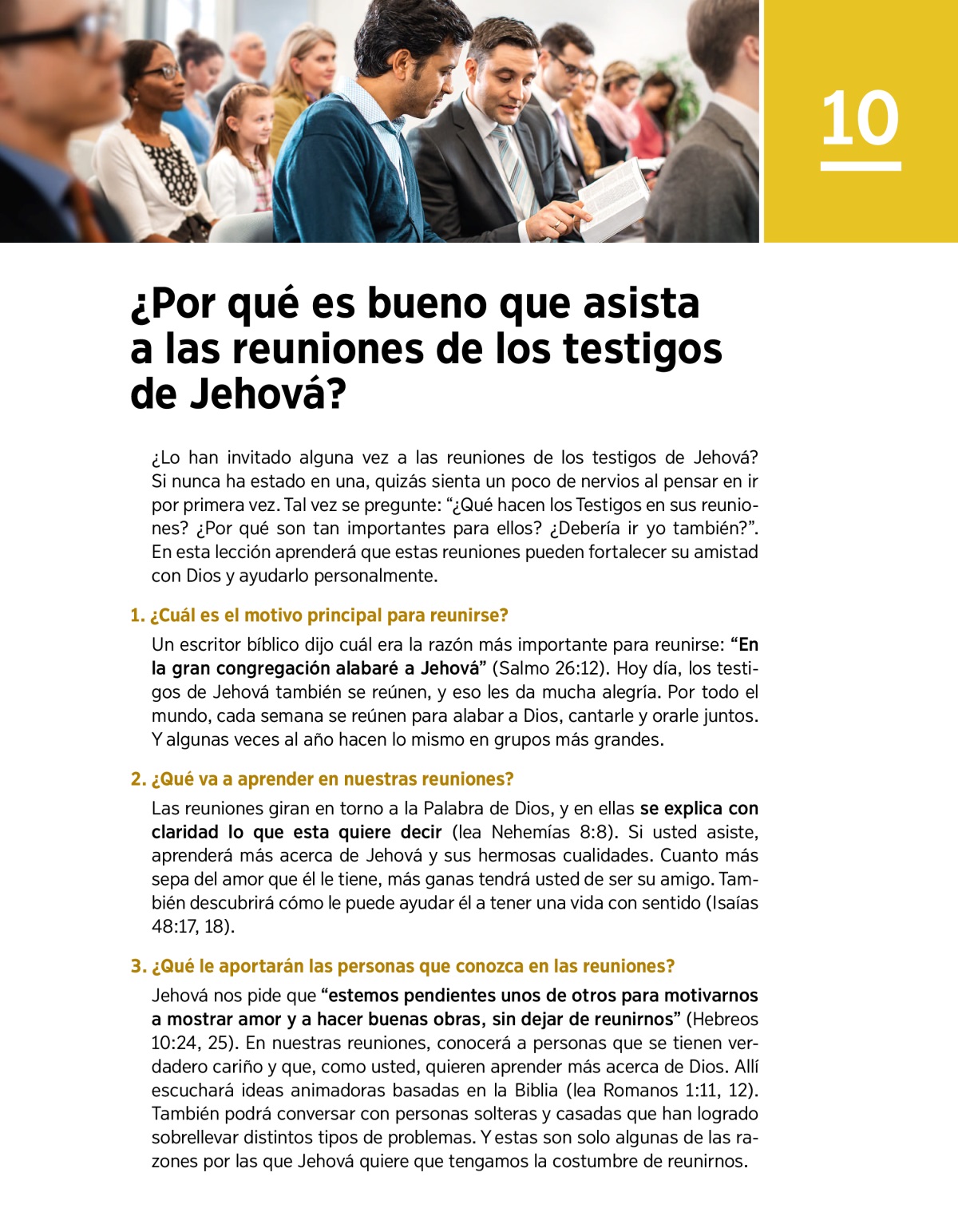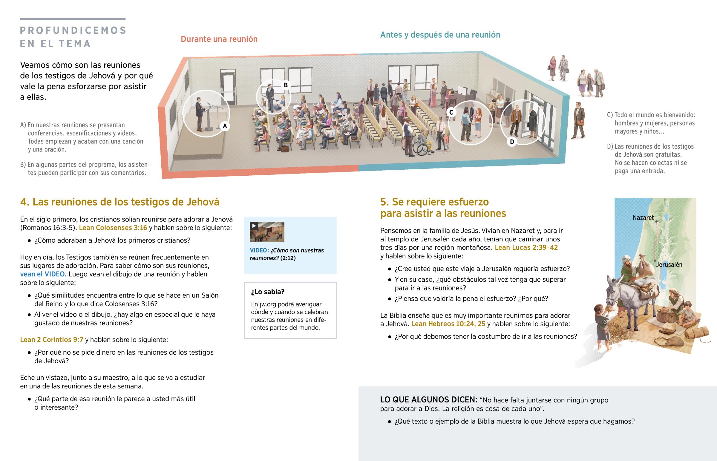 ¿Lo han invitado alguna vez a las reuniones de los testigos de Jehová? Si nunca ha estado en una, quizás sienta un poco de nervios al pensar en ir por primera vez. Tal vez se pregunte: “¿Qué hacen los Testigos en sus reuniones? ¿Por qué son tan importantes para ellos? ¿Debería ir yo también?”. En esta lección aprenderá que estas reuniones pueden fortalecer su amistad con Dios y ayudarlo personalmente.