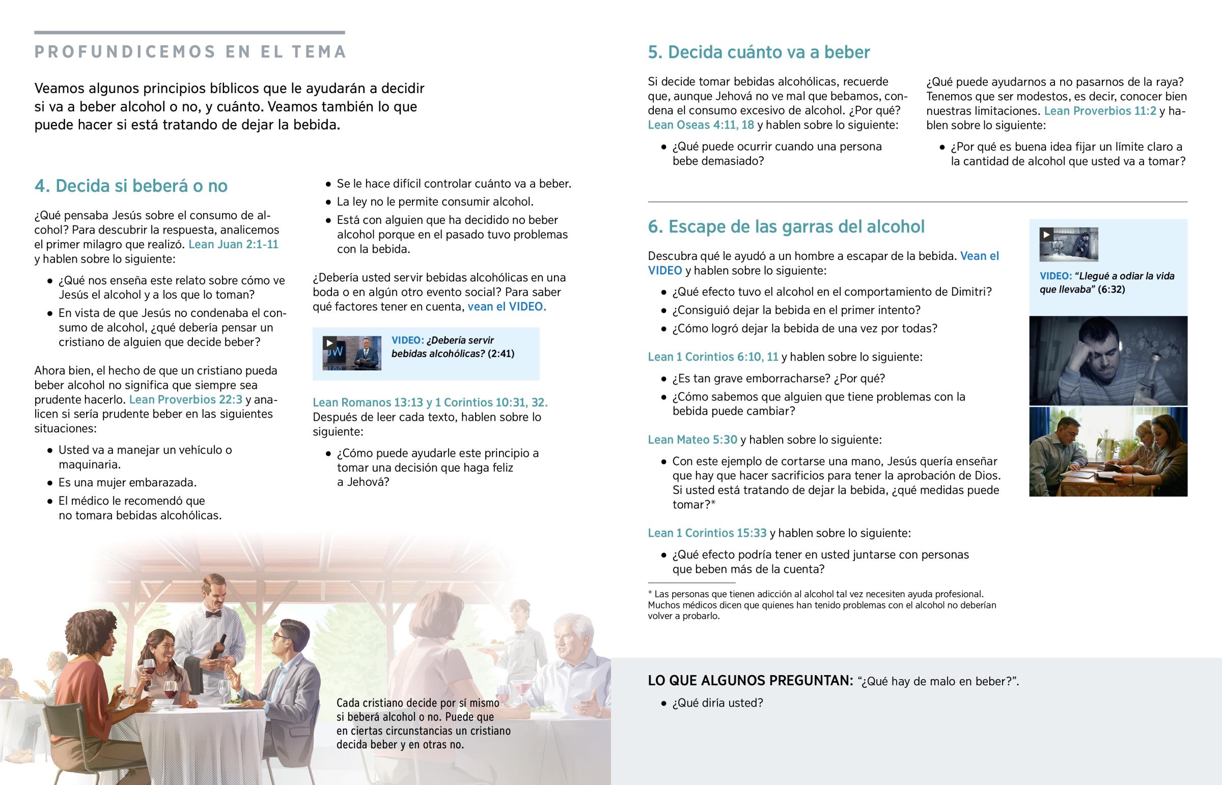 Si decide tomar bebidas alcohólicas, recuerde que, aunque Jehová no ve mal que bebamos, condena el consumo excesivo de alcohol. ¿Por qué? Lean Oseas 4:11, 18 y hablen sobre lo siguiente: