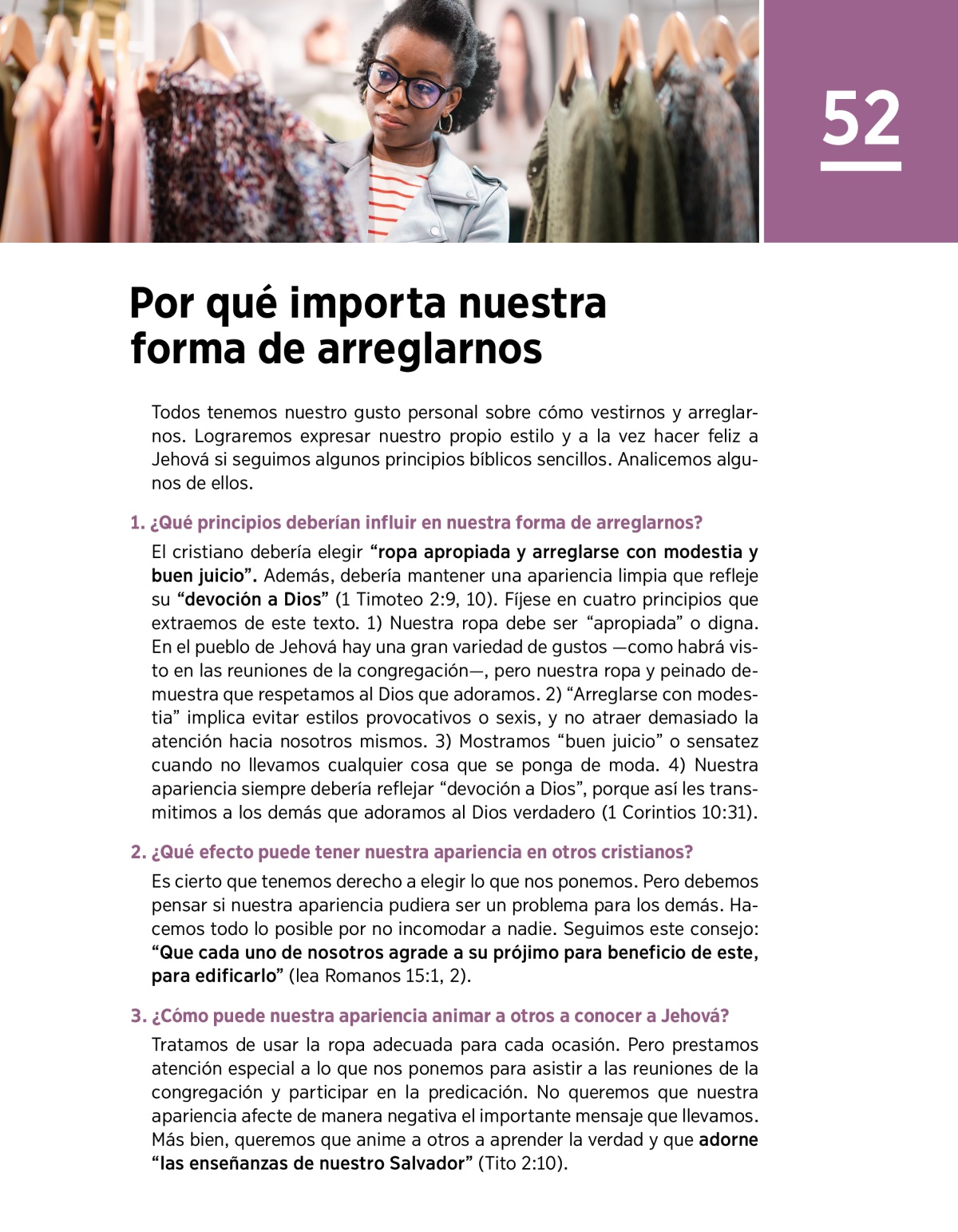 El cristiano debería elegir “ropa apropiada y arreglarse con modestia y buen juicio”. Además, debería mantener una apariencia limpia que refleje su “devoción a Dios” (1 Timoteo 2:9, 10). Fíjese en cuatro principios que extraemos de este texto. 1) Nuestra ropa debe ser “apropiada” o digna. En el pueblo de Jehová hay una gran variedad de gustos—como habrá visto en las reuniones de la congregación—, pero nuestra ropa y peinado demuestra que respetamos al Dios que adoramos. 2) “Arreglarse con modestia” implica evitar estilos provocativos o sexis, y no atraer demasiado la atención hacia nosotros mismos. 3) Mostramos “buen juicio” o sensatez cuando no llevamos cualquier cosa que se ponga de moda. 4) Nuestra apariencia siempre debería reflejar “devoción a Dios”, porque así les transmitimos a los demás que adoramos al Dios verdadero (1 Corintios 10:31).