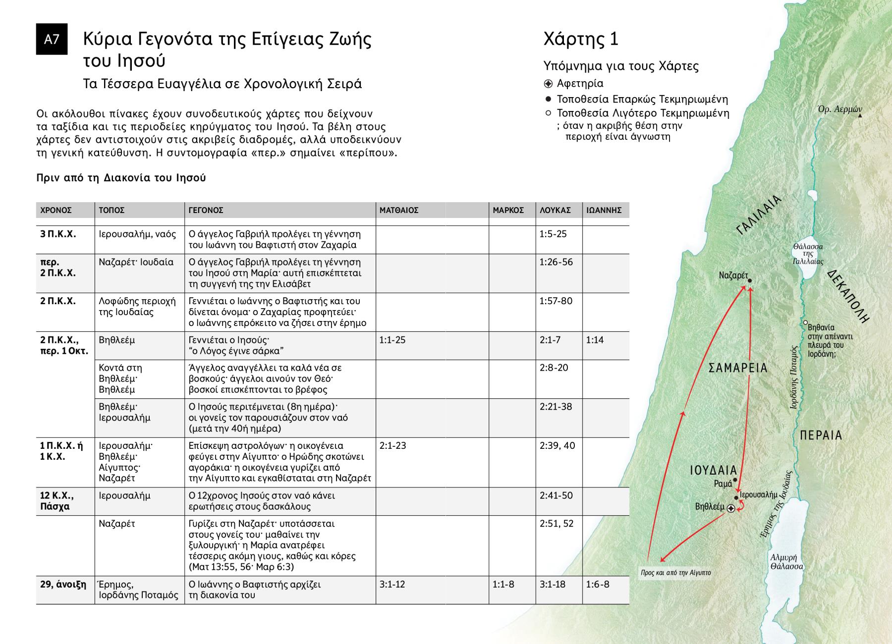 Οι ακόλουθοι πίνακες έχουν συνοδευτικούς χάρτες που δείχνουν τα ταξίδια και τις περιοδείες κηρύγματος του Ιησού. Τα βέλη στους χάρτες δεν αντιστοιχούν στις ακριβείς διαδρομές, αλλά υποδεικνύουν τη γενική κατεύθυνση. Η συντομογραφία «περ.» σημαίνει «περίπου».