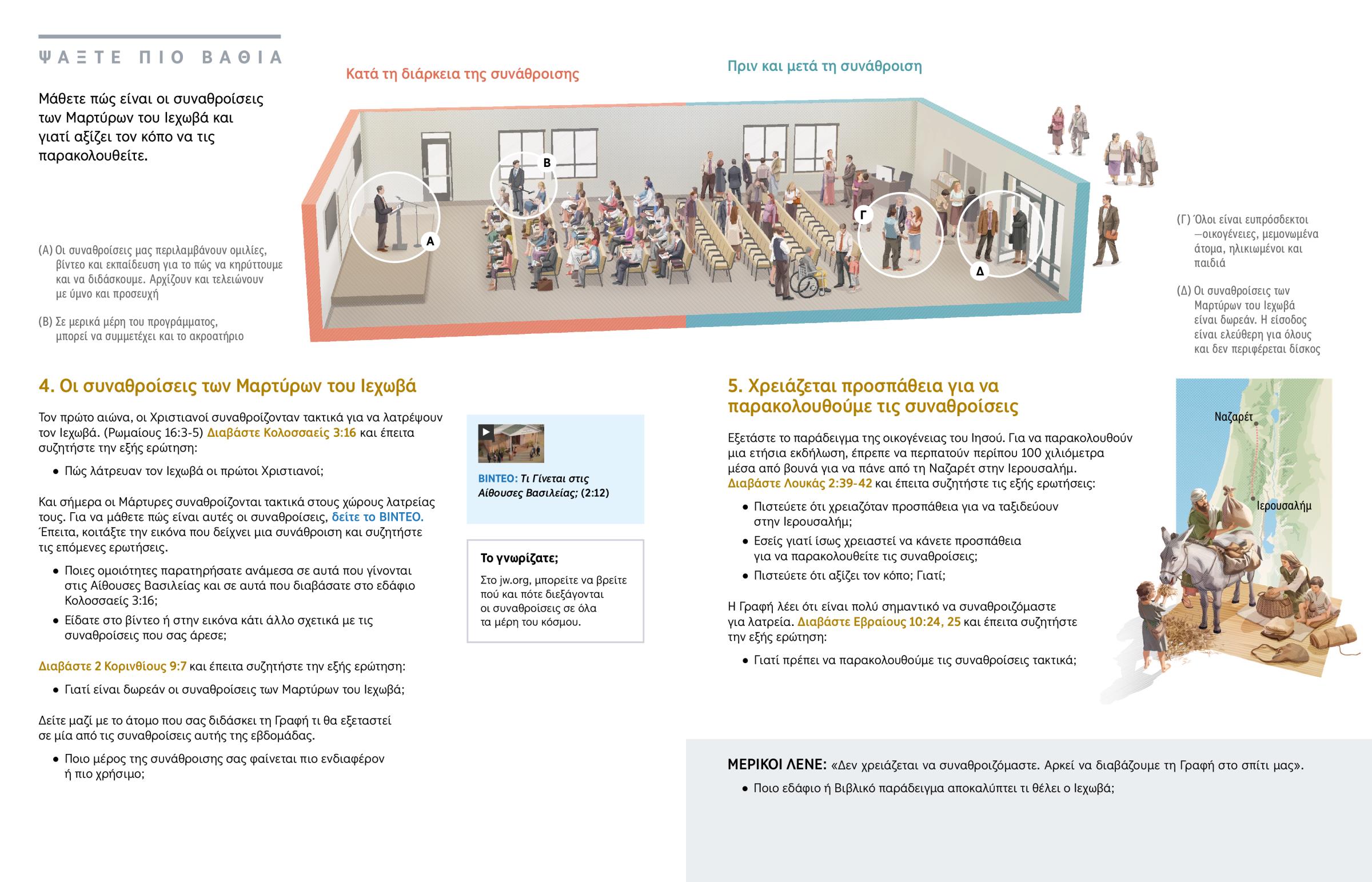 Σας έχουν καλέσει ποτέ σε μια συνάθροιση των Μαρτύρων του Ιεχωβά; Αν δεν έχετε πάει ποτέ, ίσως σας αγχώνει κάπως το πώς θα είναι αν πάτε. Ίσως αναρωτιέστε: “Τι γίνεται σε αυτές τις συναθροίσεις; Γιατί είναι σημαντικές; Γιατί να τις παρακολουθώ;” Σε αυτό το μάθημα θα μάθετε πώς μπορούν οι συναθροίσεις να σας φέρουν πιο κοντά στον Θεό και να σας βοηθήσουν προσωπικά.