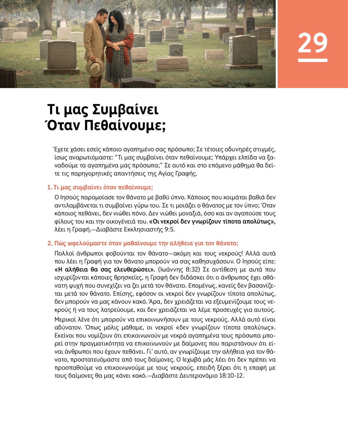 Έχετε χάσει εσείς κάποιο αγαπημένο σας πρόσωπο; Σε τέτοιες οδυνηρές στιγμές, ίσως αναρωτιόμαστε: “Τι μας συμβαίνει όταν πεθαίνουμε; Υπάρχει ελπίδα να ξαναδούμε τα αγαπημένα μας πρόσωπα;” Σε αυτό και στο επόμενο μάθημα θα δείτε τις παρηγορητικές απαντήσεις της Αγίας Γραφής.