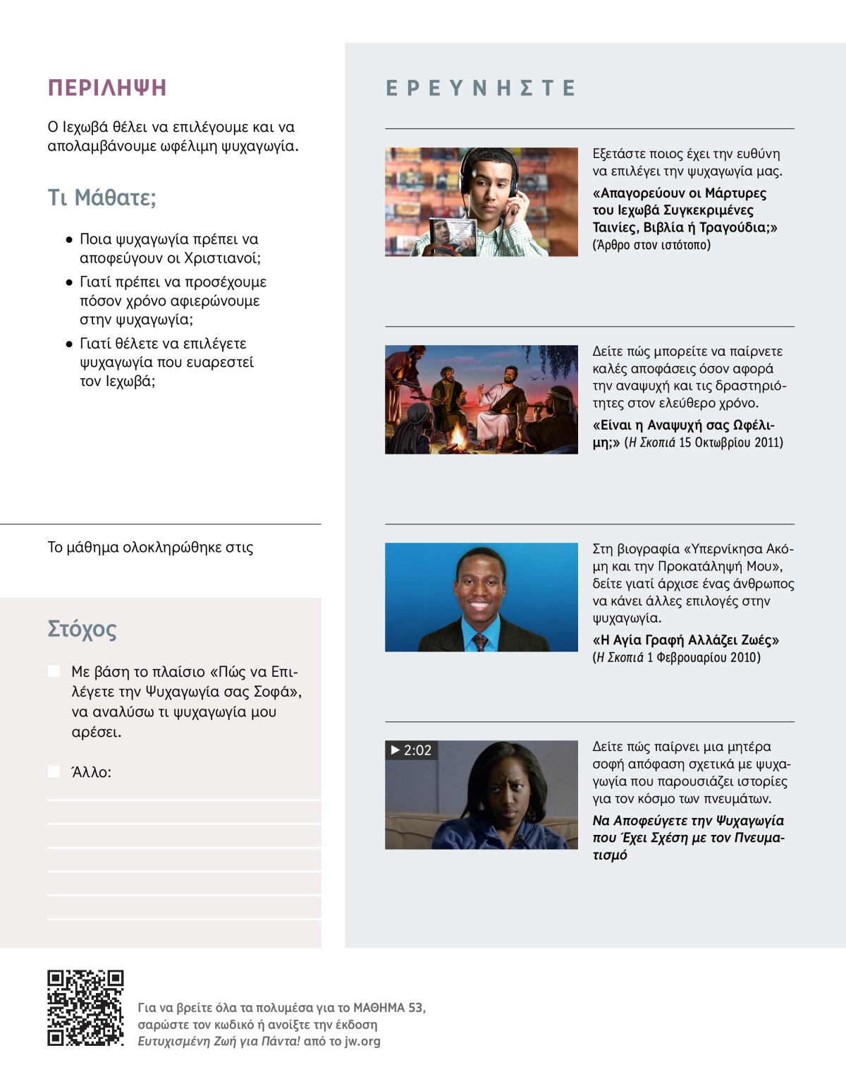 Ο Ιεχωβά είναι “ο ευτυχισμένος Θεός”. (1 Τιμόθεο 1:11) Θέλει να είμαστε ευτυχισμένοι και να απολαμβάνουμε τη ζωή μας. Χαίρεται όταν ξεχωρίζουμε χρόνο για να ξεκουραζόμαστε από τις εργασίες μας και να χαλαρώνουμε. Σε αυτό το μάθημα, θα δούμε πώς μπορούμε να χρησιμοποιούμε τον ελεύθερο χρόνο μας με τρόπους που μας δίνουν ευχαρίστηση και ικανοποίηση, αλλά και ευαρεστούν τον Ιεχωβά.