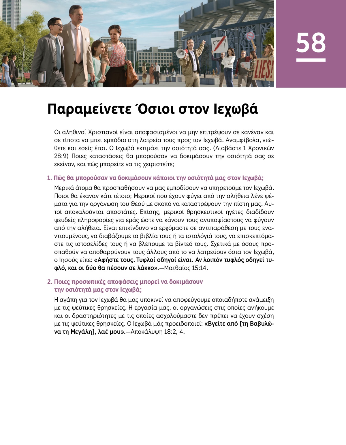 Οι αληθινοί Χριστιανοί είναι αποφασισμένοι να μην επιτρέψουν σε κανέναν και σε τίποτα να μπει εμπόδιο στη λατρεία τους προς τον Ιεχωβά. Αναμφίβολα, νιώθετε και εσείς έτσι. Ο Ιεχωβά εκτιμάει την οσιότητά σας. (Διαβάστε 1 Χρονικών 28:9) Ποιες καταστάσεις θα μπορούσαν να δοκιμάσουν την οσιότητά σας σε εκείνον, και πώς μπορείτε να τις χειριστείτε;