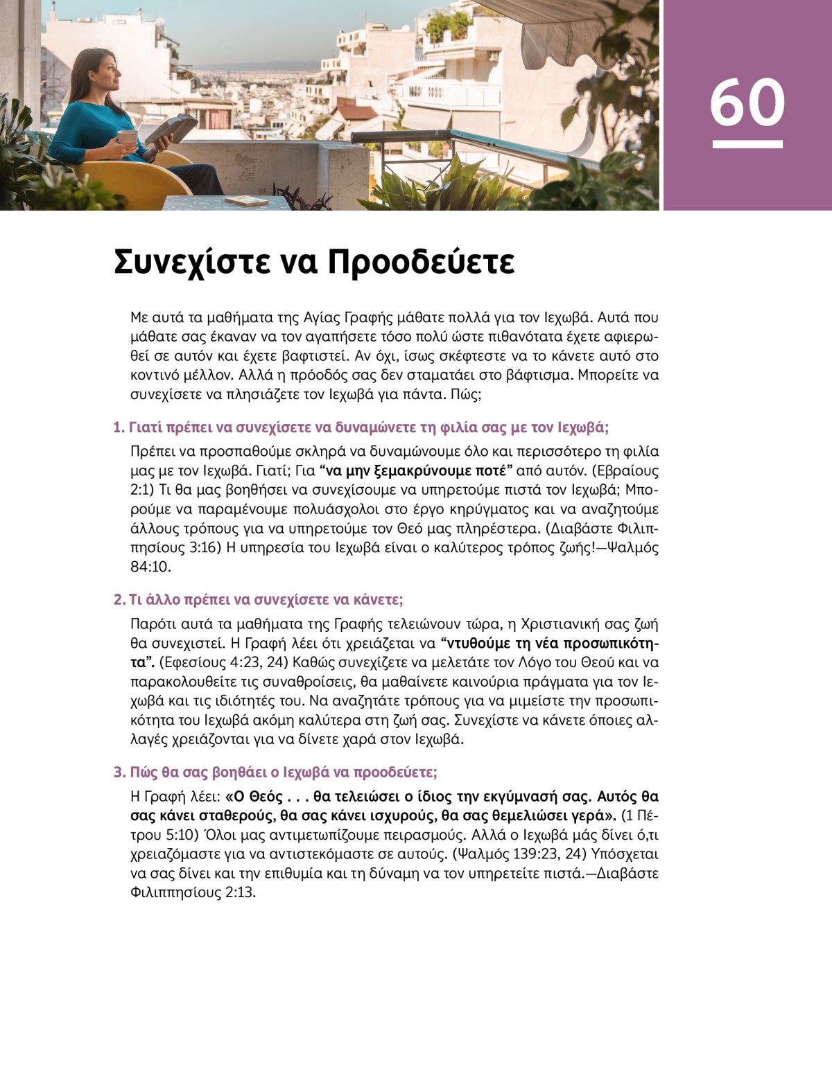 Παρότι αυτά τα μαθήματα της Γραφής τελειώνουν τώρα, η Χριστιανική σας ζωή θα συνεχιστεί. Η Γραφή λέει ότι χρειάζεται να “ντυθούμε τη νέα προσωπικότητα”. (Εφεσίους 4:23, 24) Καθώς συνεχίζετε να μελετάτε τον Λόγο του Θεού και να παρακολουθείτε τις συναθροίσεις, θα μαθαίνετε καινούρια πράγματα για τον Ιεχωβά και τις ιδιότητές του. Να αναζητάτε τρόπους για να μιμείστε την προσωπικότητα του Ιεχωβά ακόμη καλύτερα στη ζωή σας. Συνεχίστε να κάνετε όποιες αλλαγές χρειάζονται για να δίνετε χαρά στον Ιεχωβά.