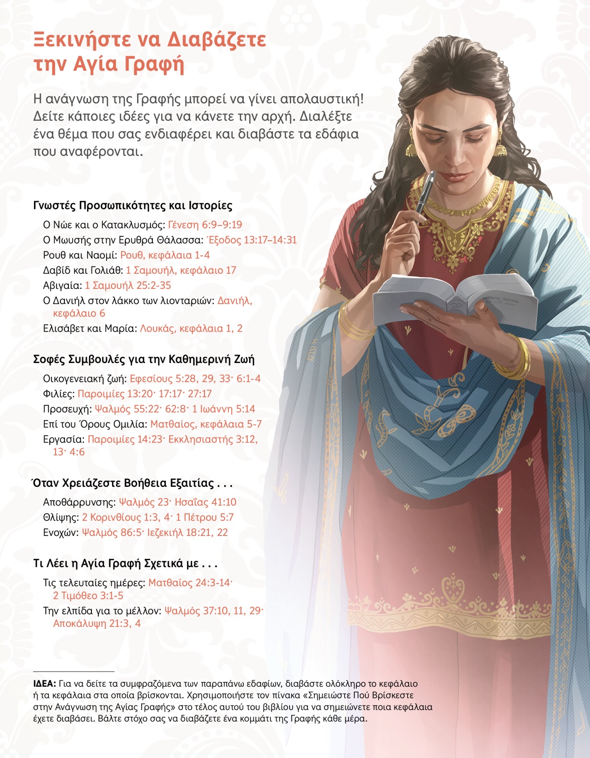 ΙΔΕΑ: Για να δείτε τα συμφραζόμενα των παραπάνω εδαφίων, διαβάστε ολόκληρο το κεφάλαιο ή τα κεφάλαια στα οποία βρίσκονται. Χρησιμοποιήστε τον πίνακα «Σημειώστε Πού Βρίσκεστε στην Ανάγνωση της Αγίας Γραφής» στο τέλος αυτού του βιβλίου για να σημειώνετε ποια κεφάλαια έχετε διαβάσει. Βάλτε στόχο σας να διαβάζετε ένα κομμάτι της Γραφής κάθε μέρα.