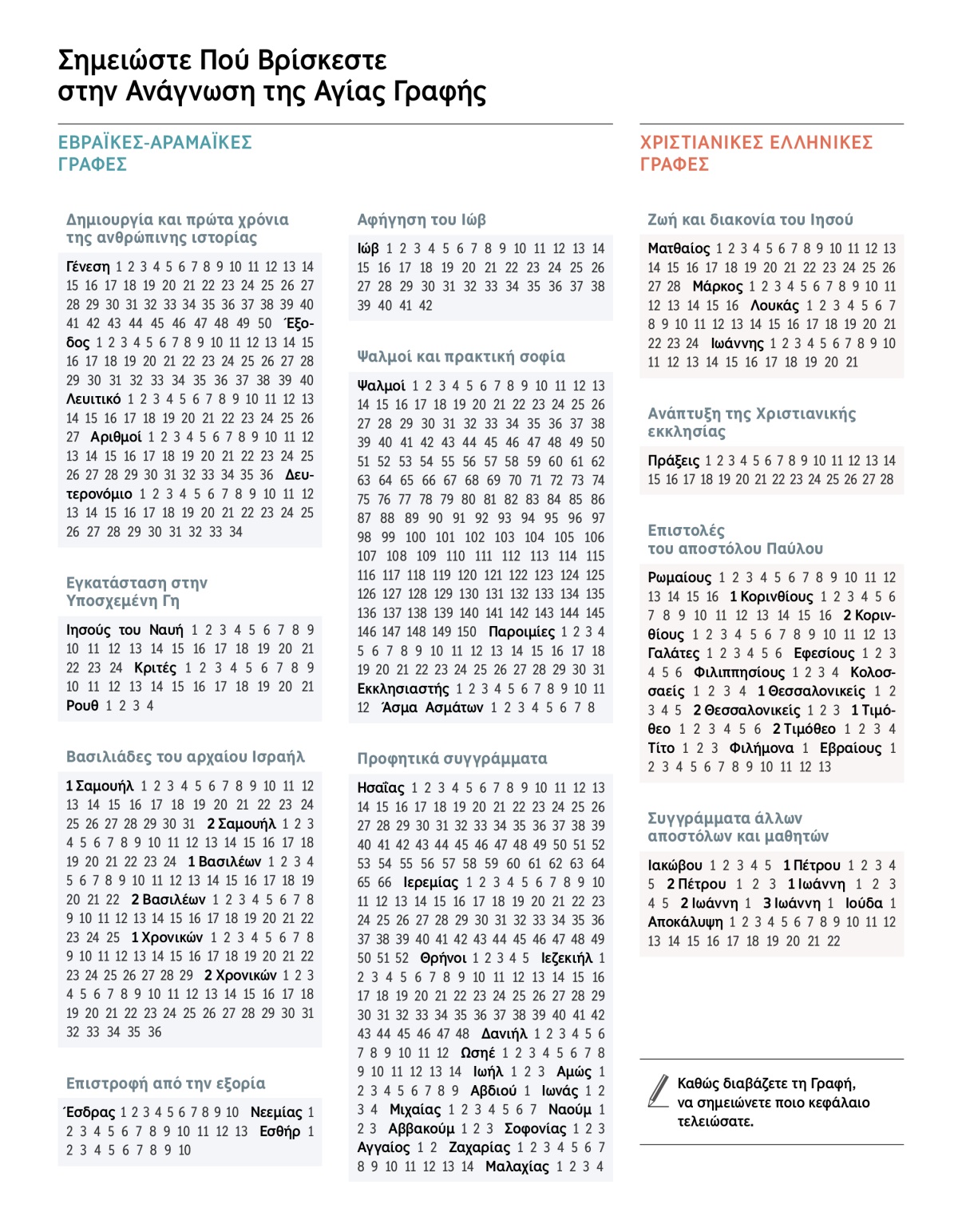 Καθώς διαβάζετε τη Γραφή, να σημειώνετε ποιο κεφάλαιο τελειώσατε.