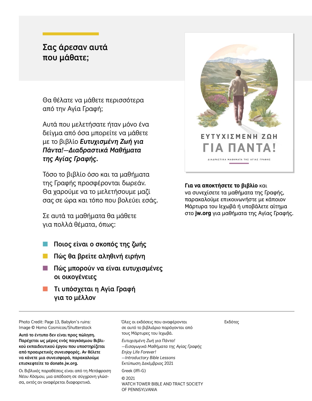 Για να αποκτήσετε το βιβλίο και να συνεχίσετε τα μαθήματα της Γραφής, παρακαλούμε επικοινωνήστε με κάποιον Μάρτυρα του Ιεχωβά ή υποβάλετε αίτημα στο jw.org για μαθήματα της Αγίας Γραφής.