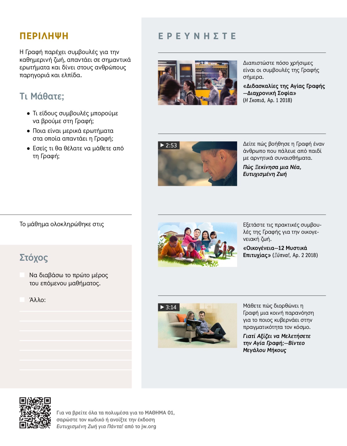Η Γραφή μάς δίνει καλές συμβουλές. Για παράδειγμα, διδάσκει στις οικογένειες πώς να είναι πραγματικά ευτυχισμένες. Μας δείχνει πώς να διαχειριζόμαστε το άγχος και πώς να απολαμβάνουμε την εργασία μας. Θα μάθετε τι διδάσκει η Γραφή για αυτά τα θέματα και για πολλά άλλα καθώς θα εξετάζουμε μαζί αυτά τα μαθήματα. Πιστεύουμε πως θα συμφωνήσετε ότι «όλη η Γραφή [δηλαδή τα πάντα σε αυτήν] είναι . . . ωφέλιμη».—2 Τιμόθεο 3:16.