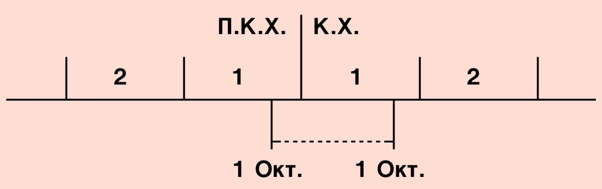 Όταν μετράμε τα χρόνια ανάμεσα σε μια ημερομηνία «Π.Κ.Χ.» και σε μια ημερομηνία της «Κ.Χ.», πρέπει να έχουμε υπόψη ότι από μια ημερομηνία όπως η 1η Οκτωβρίου του έτους 1 Π.Κ.Χ. μέχρι την 1η Οκτωβρίου του έτους 1 Κ.Χ. μεσολαβεί μόνο ένας χρόνος, και όχι δύο, όπως φαίνεται σε αυτό το διάγραμμα: