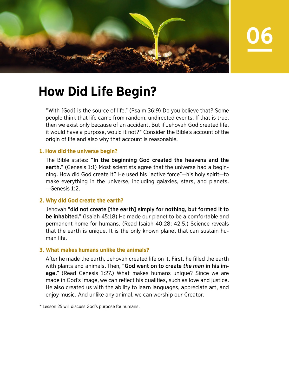 “With [God] is the source of life.” (Psalm 36:9) Do you believe that? Some people think that life came from random, undirected events. If that is true, then we exist only because of an accident. But if Jehovah God created life, it would have a purpose, would it not?a Consider the Bible’s account of the origin of life and also why that account is reasonable.