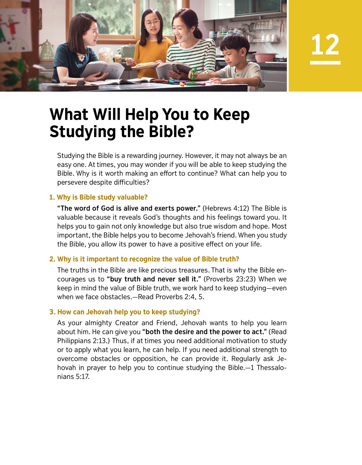 “The word of God is alive and exerts power.” (Hebrews 4:12) The Bible is valuable because it reveals God’s thoughts and his feelings toward you. It helps you to gain not only knowledge but also true wisdom and hope. Most important, the Bible helps you to become Jehovah’s friend. When you study the Bible, you allow its power to have a positive effect on your life.