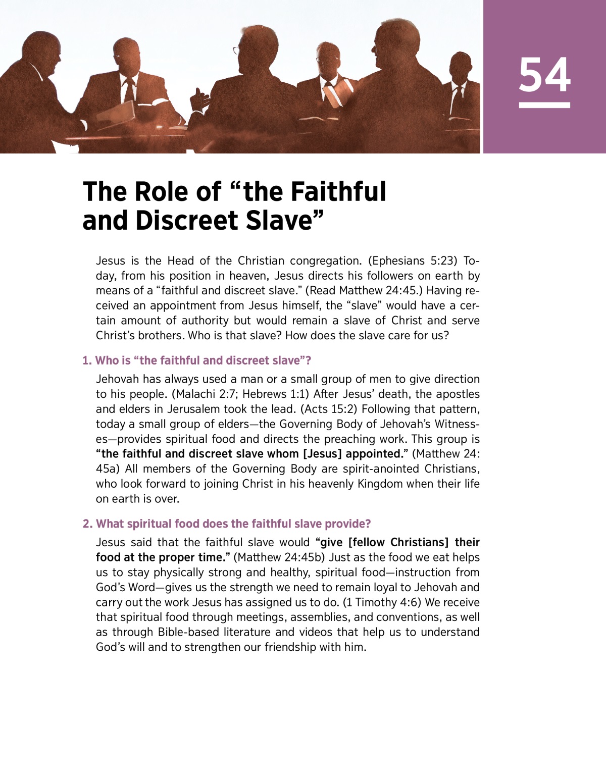 Jehovah has always used a man or a small group of men to give direction to his people. (Malachi 2:7; Hebrews 1:1) After Jesus’ death, the apostles and elders in Jerusalem took the lead. (Acts 15:2) Following that pattern, today a small group of elders—the Governing Body of Jehovah’s Witnesses—provides spiritual food and directs the preaching work. This group is “the faithful and discreet slave whom [Jesus] appointed.” (Matthew 24:45a) All members of the Governing Body are spirit-anointed Christians, who look forward to joining Christ in his heavenly Kingdom when their life on earth is over.