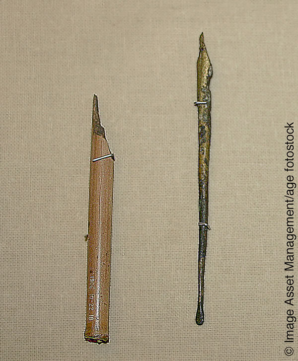 The scribe’s pen was a length of hard reed. It was cut diagonally across one end and finely slit through the point. A scribe could resharpen the point with a pumice stone. The reed resembled and functioned much like a modern fountain pen that has a metal nib.