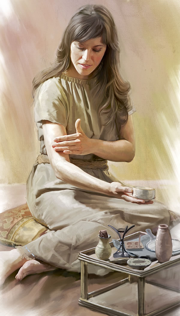After bathing, the woman applies some fragrant oil over her softened skin. Then she opens a colorfully ornamented box that contains a collection of small bottles, vases, and jars made of glass, ivory, shell, or stone. In them she has an assortment of oils and perfumes that are delicately scented with balsam, cardamom, cinnamon, frankincense, honey, myrrh, and the like.