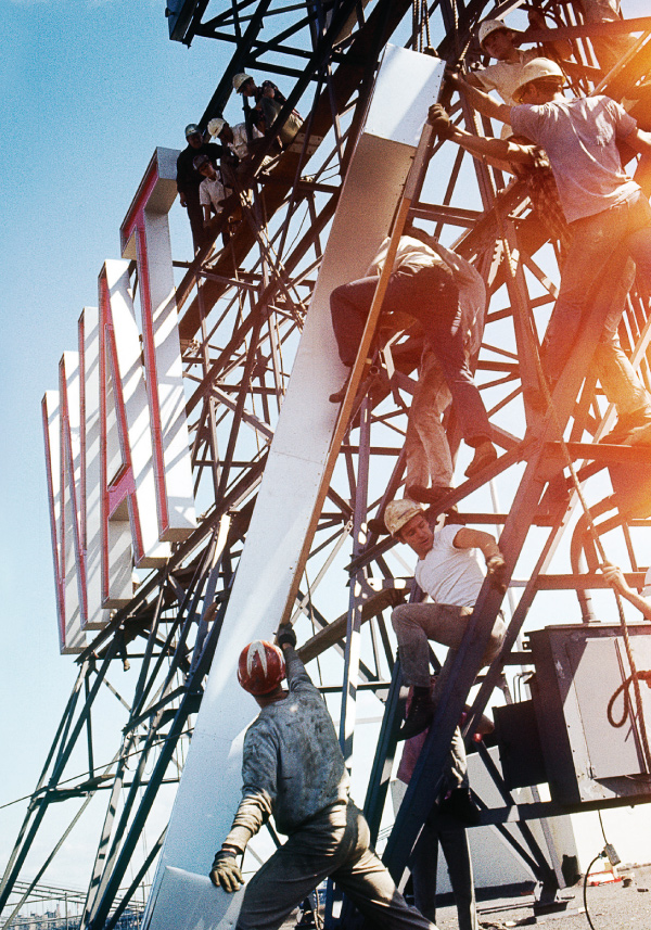 Brothers erecting the letters for the neon “Watchtower” sign in 1970