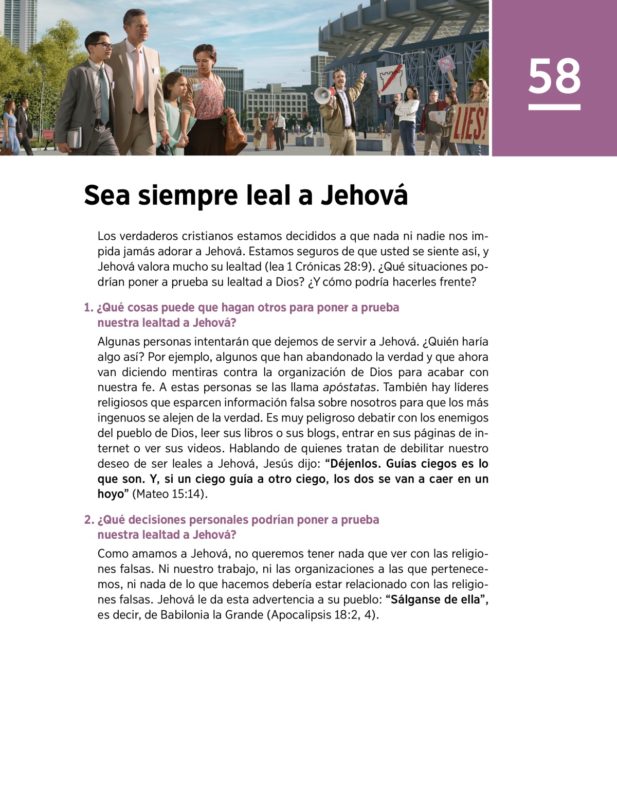 Los verdaderos cristianos estamos decididos a que nada ni nadie nos impida jamás adorar a Jehová. Estamos seguros de que usted se siente así, y Jehová valora mucho su lealtad (lea 1 Crónicas 28:9). ¿Qué situaciones podrían poner a prueba su lealtad a Dios? ¿Y cómo podría hacerles frente?