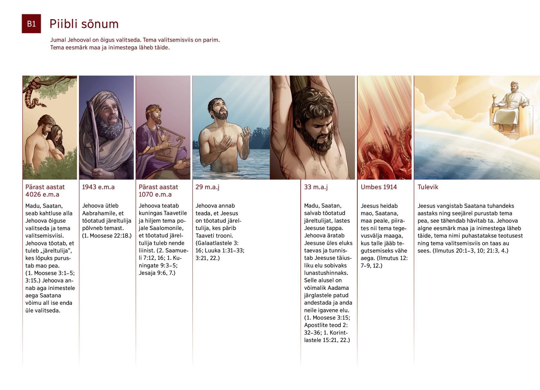 33 m.a.j Madu, Saatan, salvab tõotatud järeltulijat, lastes Jeesuse tappa. Jehoova äratab Jeesuse üles eluks taevas ja tunnistab Jeesuse täiusliku elu sobivaks lunastushinnaks. Selle alusel on võimalik Aadama järglastele patud andestada ja anda neile igavene elu. (1. Moosese 3:15; Apostlite teod 2:32–36; 1. Korintlastele 15:21, 22.) |