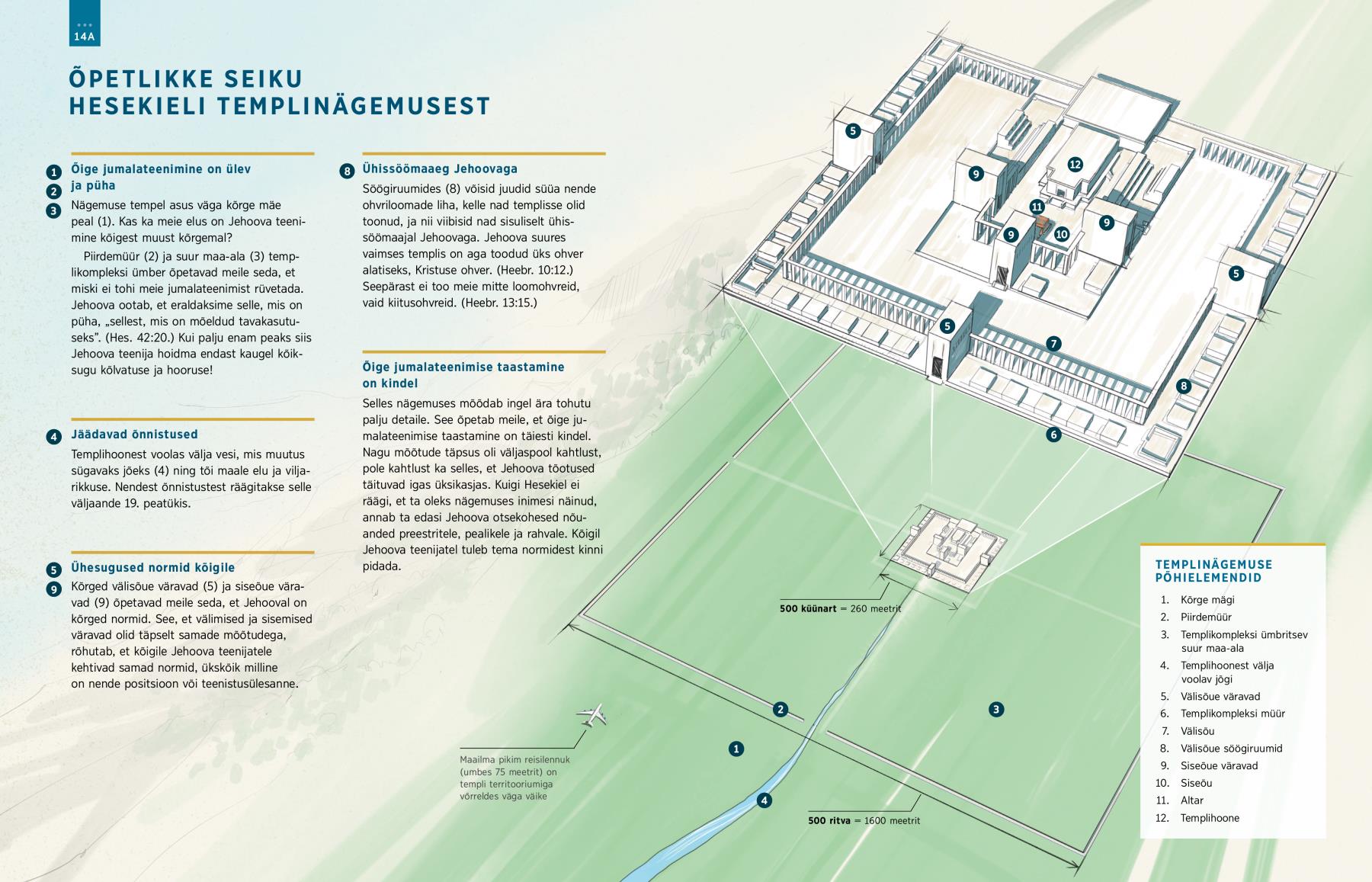 Piirdemüür (2) ja suur maa-ala (3) templikompleksi ümber õpetavad meile seda, et miski ei tohi meie jumalateenimist rüvetada. Jehoova ootab, et eraldaksime selle, mis on püha, „sellest, mis on mõeldud tavakasutuseks”. (Hes. 42:20.) Kui palju enam peaks siis Jehoova teenija hoidma endast kaugel kõiksugu kõlvatuse ja hooruse!
